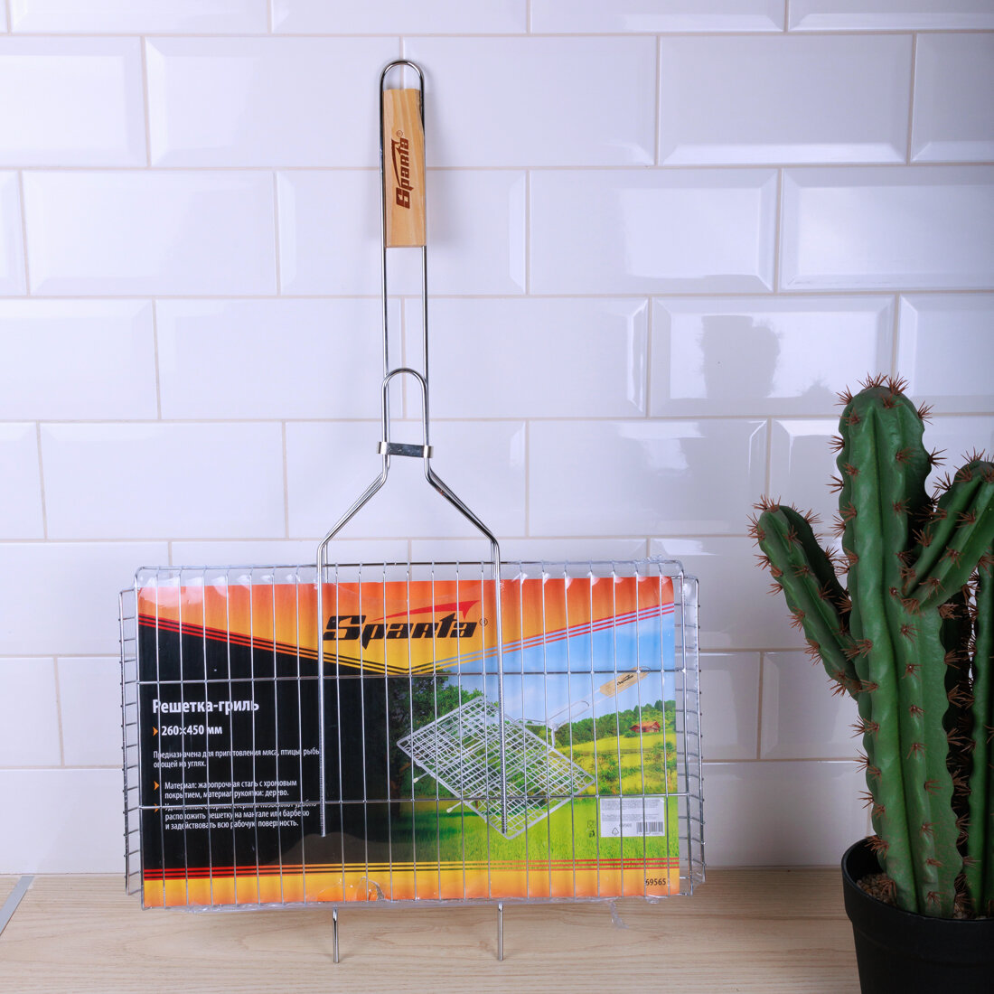 Хромированная решетка-гриль Spartaразмером 260 х 450 мм будет полезна для любителей блюд, приготовленных на углях. С ее помощью можно качественно и равномерно пожарить мясо, овощи, птицу и рыбу, поэтому они получаются вкусными и сочными.Преимущества Долговечность и надежность решетки достигается за счет качественного материала изготовления — жаропрочной пищевой стали с хромовым покрытием Рукоятка из древесины удобно лежит в руках и приятна на ощупь Решетка имеет увеличенные опорные стержни, благодаря чему она надежно фиксируется на мангале, а рабочая поверхность при этом используется полностью