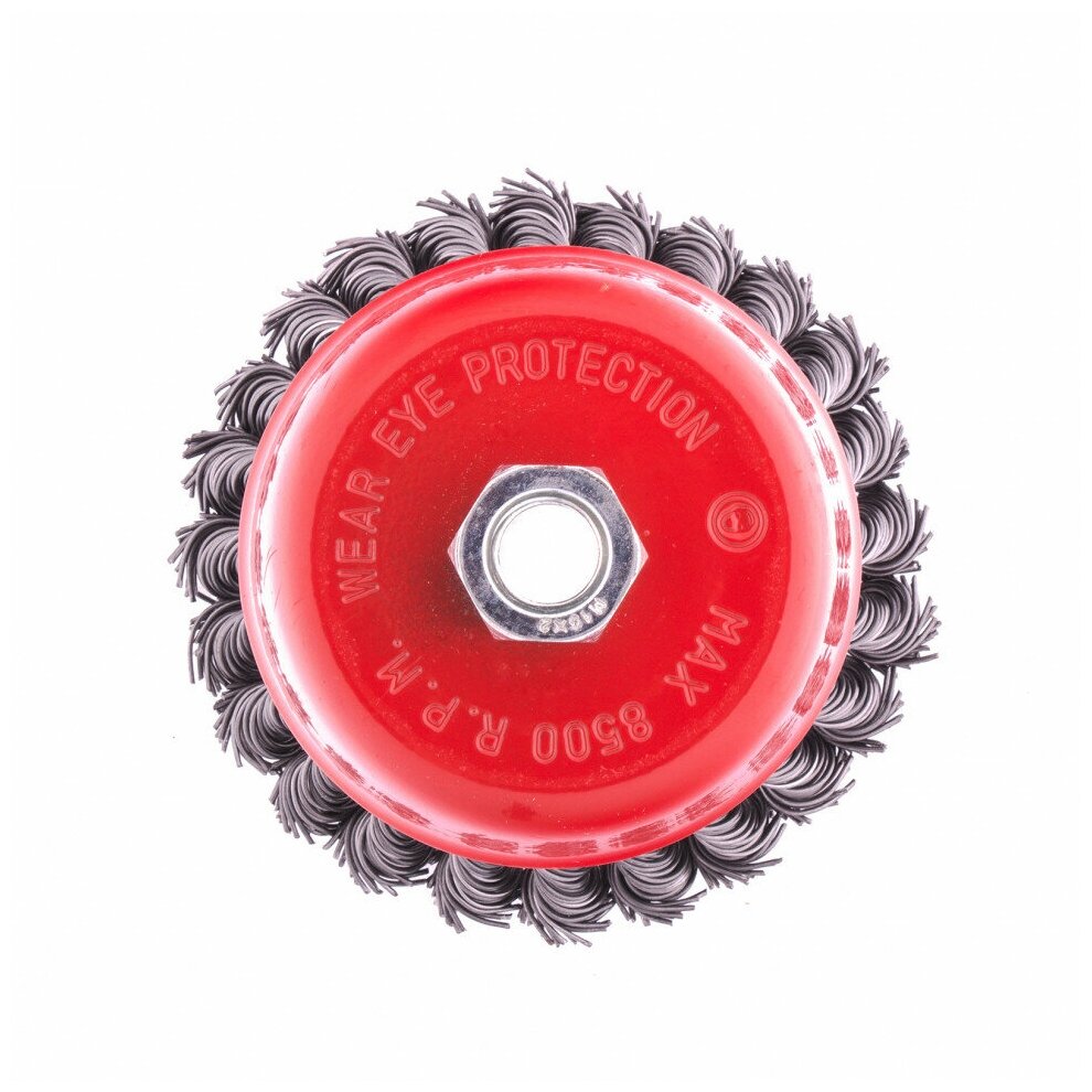 Щетка Matrix «Чашка» диаметром 100 мм, М14, с крученой проволокой 0,8 мм, применяется в качестве оснастки на УШМ. Щетина рассчитана на грубую (черновую) обработку поверхностей, более агрессивную в сравнении с щетиной 0,5 мм. Изделие подходит для удаления загрязнений, снятия толстого слоя ржавчины, ЛКМ, зачистки сварных швов. Рекомендуемая скорость использования — 8500 об/мин. Преимущества Благодаря высококачественной проволоке оснастка прослужит долгое время. Благодаря форме «чашка» насадка имеет большую площадь прилегания, поэтому оптимально подходит для обработки больших поверхностей. Щетку универсального назначения можно использовать для обработки любых твердых материалов: металла, древесины, цветных металлов, пластика и др. Корпус покрыт эмалью, а щетина — маслом, за счет чего щетка устойчива к коррозии.