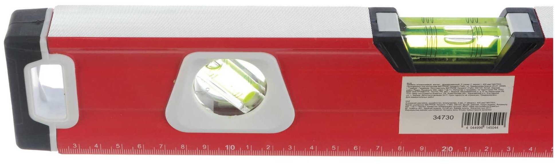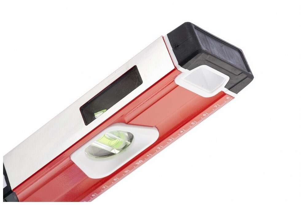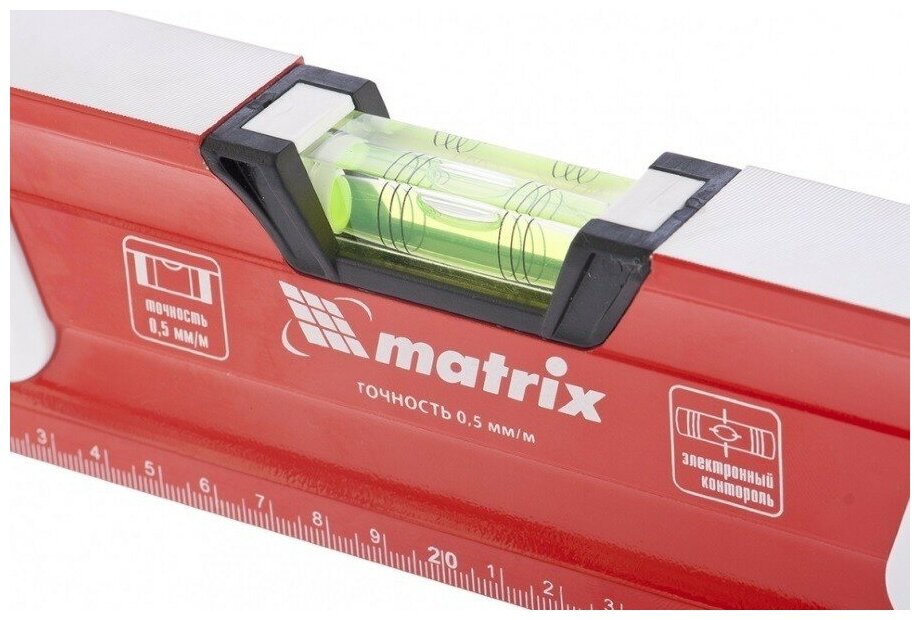 Инструмент Matrix оснащен небольшой шкалой на 40 см, выполняющей функцию линейки, а также тремя ампулами. С помощью данного приспособления вы легко осуществите выравнивание по горизонтали или вертикали, а также сможете работать с наклонными поверхностями. Это позволяет быстро и идеально точно провести монтажные и ремонтные работы.