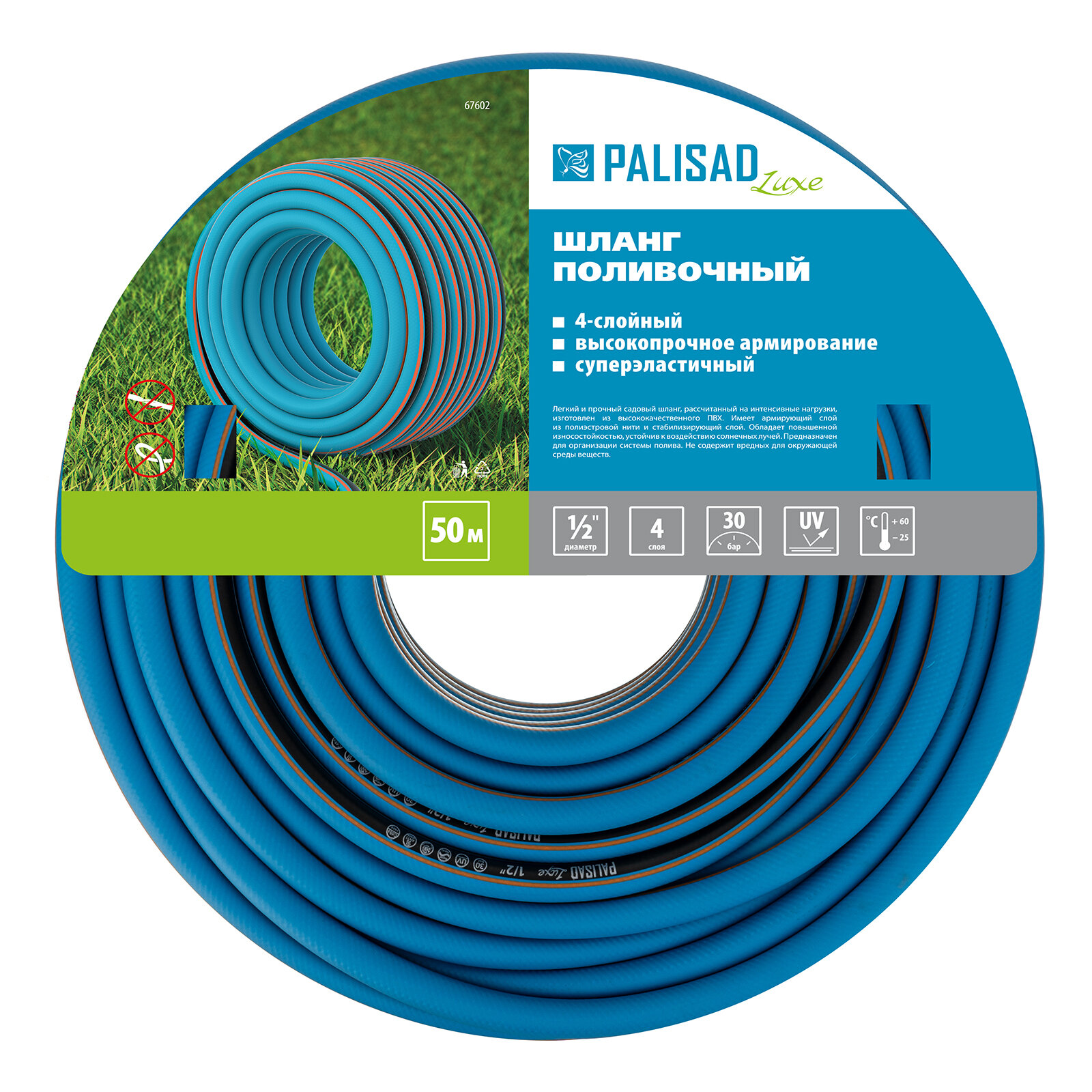 | Прочие особенности и свойства | Предназначен для орошения почвы на садовых и парковых участках., Изготовлен из ПВХ cамого высокого качества., Материал армирующего слоя - суперпрочная полиэстерная нить., Высокая эластичность и защитное покрытие «Soft Touch» обеспечивают устойчивость изделия к повреждениям и ультрафиолетовым лучам., Рассчитан на эксплуатацию в условиях повышенной (интенсивной) нагрузки., Имеет длительный срок использования., Максимальная нагрузка - 30 бар., Диапазон рабочих температур от –25 до +60 °С., Не содержит вредные для окружающей среды вещества., Совместим со всеми элементами системы полива Palisad и Palisad Luxe. |