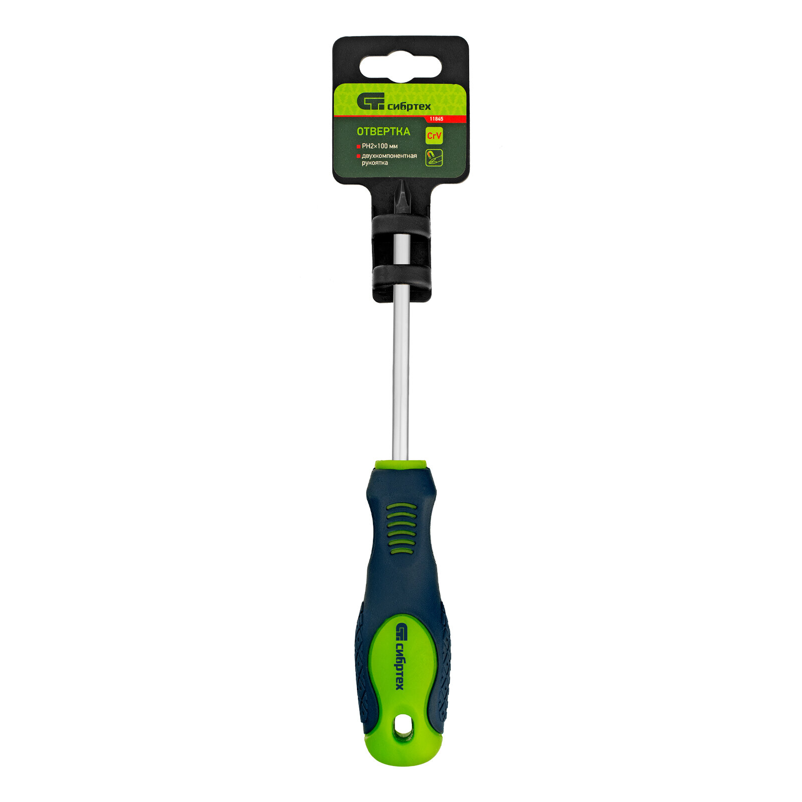 | Прочие особенности и свойства | Отвертка СИБРТЕХ 11845 ph2 х 100мм crv 2-х компонентная рукоятка Отвертки изготовлены из высококачественной хромованадиевой стали. Предназначены для монтажа/демонтажа резьбовых соединений. Двухкомпонентная рукоятка удобно и надежно фиксируется в руке. Твердость рабочей части составляет 50-54 HRC. Отвертки снабжены подвесной картой, удобной для размещения инструмента на стенде. |