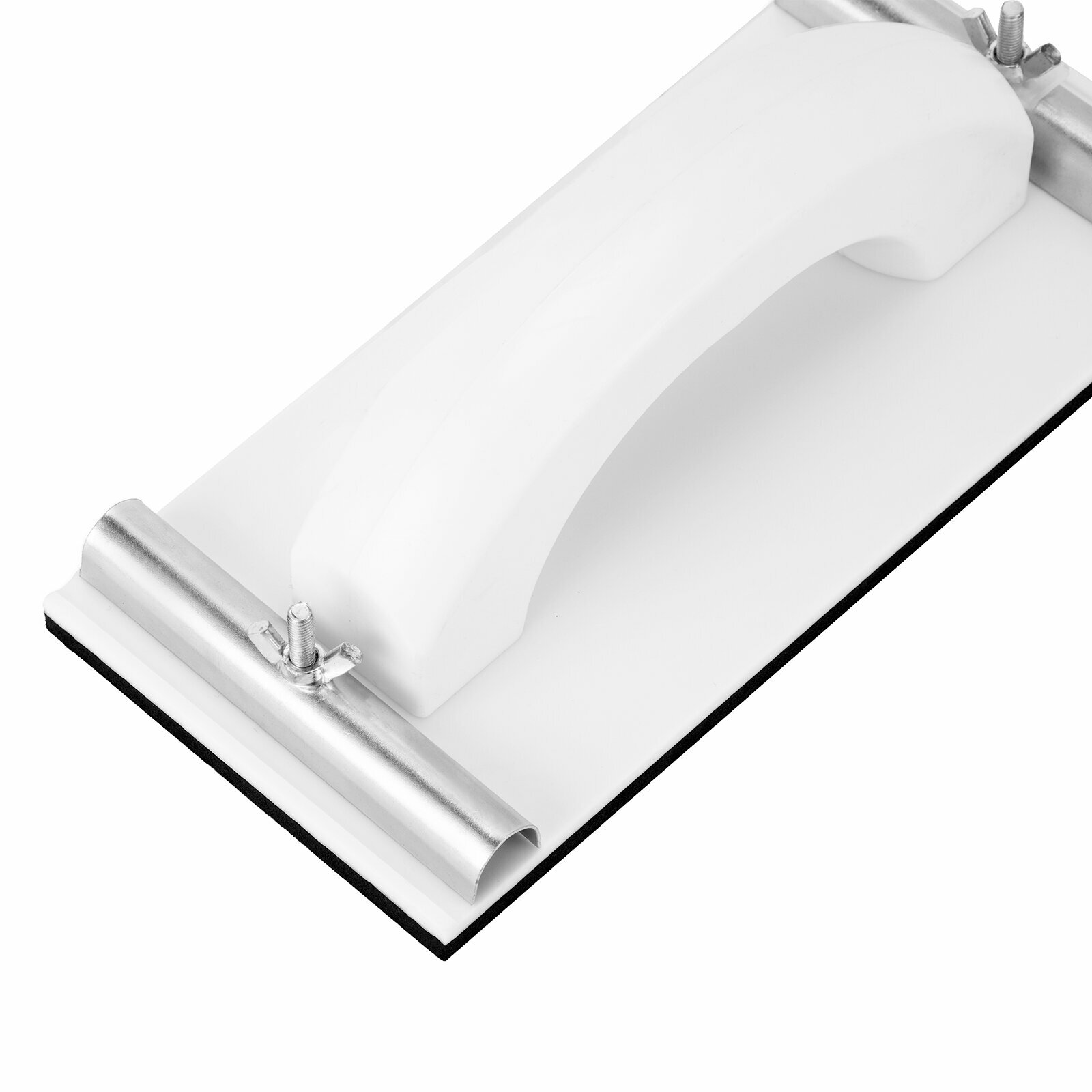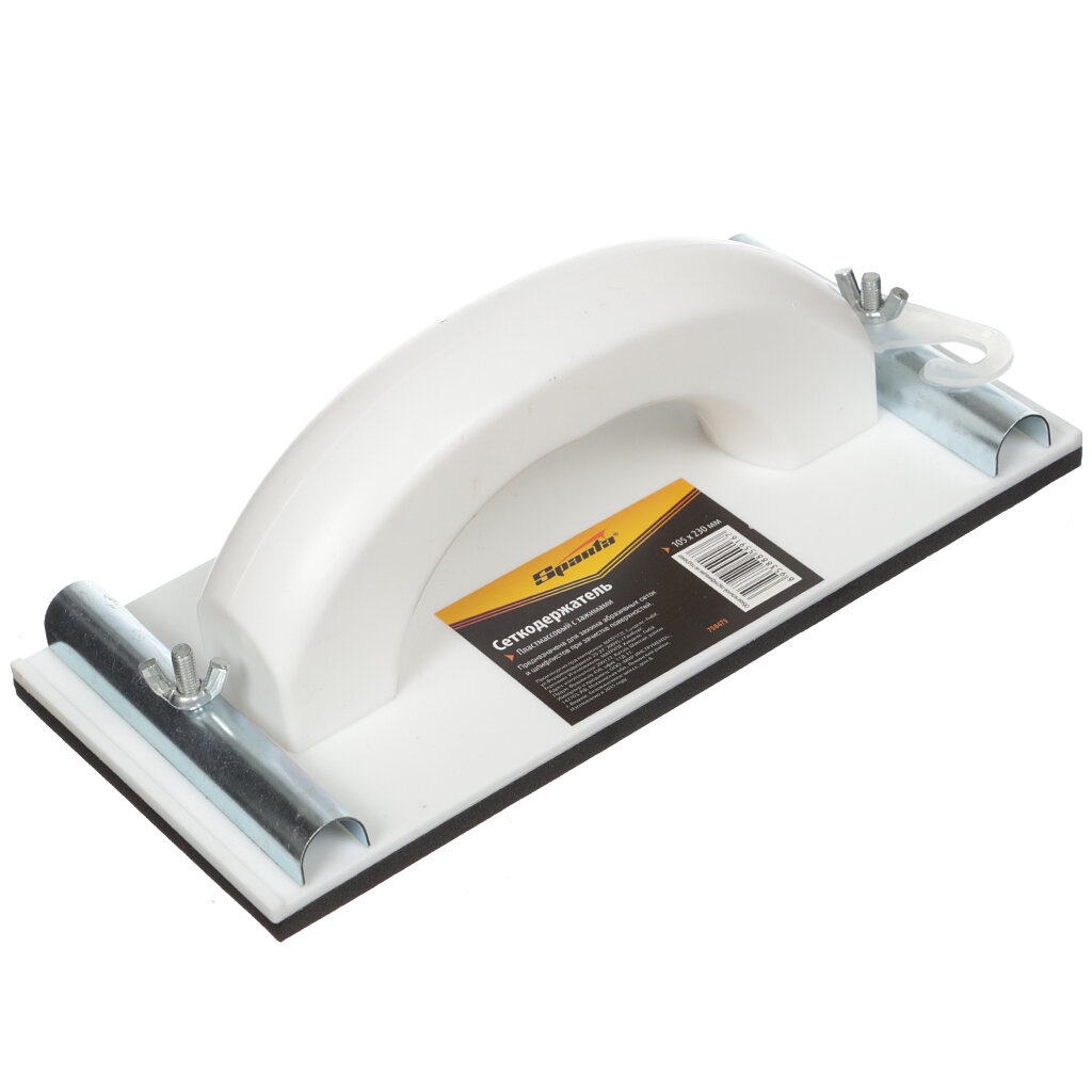 Пластмассовый сеткодержатель для шлифования имеет специальные металлические фиксаторы для зажима шлифовальной бумаги, абразивной сетки. Размер инструмента 230 x 105 мм, производитель Sparta.
