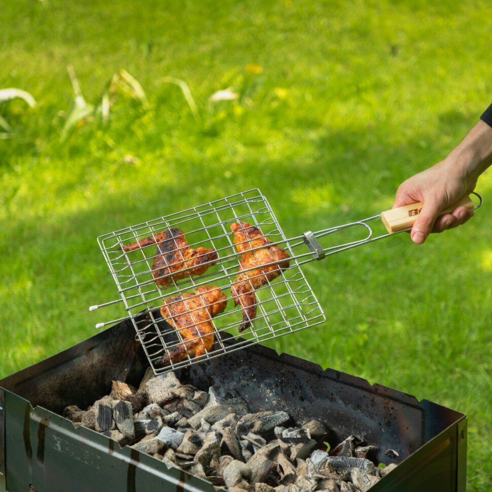 Решетка-гриль Sparta , 230х230 мм, хромированная будет полезна для любителей блюд, приготовленных на углях. С ее помощью можно качественно и равномерно пожарить мясо, овощи, птицу и рыбу, поэтому они получаются вкусными и сочными.Преимущества Долговечность и надежность решетки достигается за счет качественного материала изготовления — жаропрочной пищевой стали с хромовым покрытием Рукоятка из древесины удобно лежит в руках и приятна на ощупь Решетка имеет увеличенные опорные стержни, благодаря чему она надежно фиксируется на мангале, а рабочая поверхность при этом используется полностью