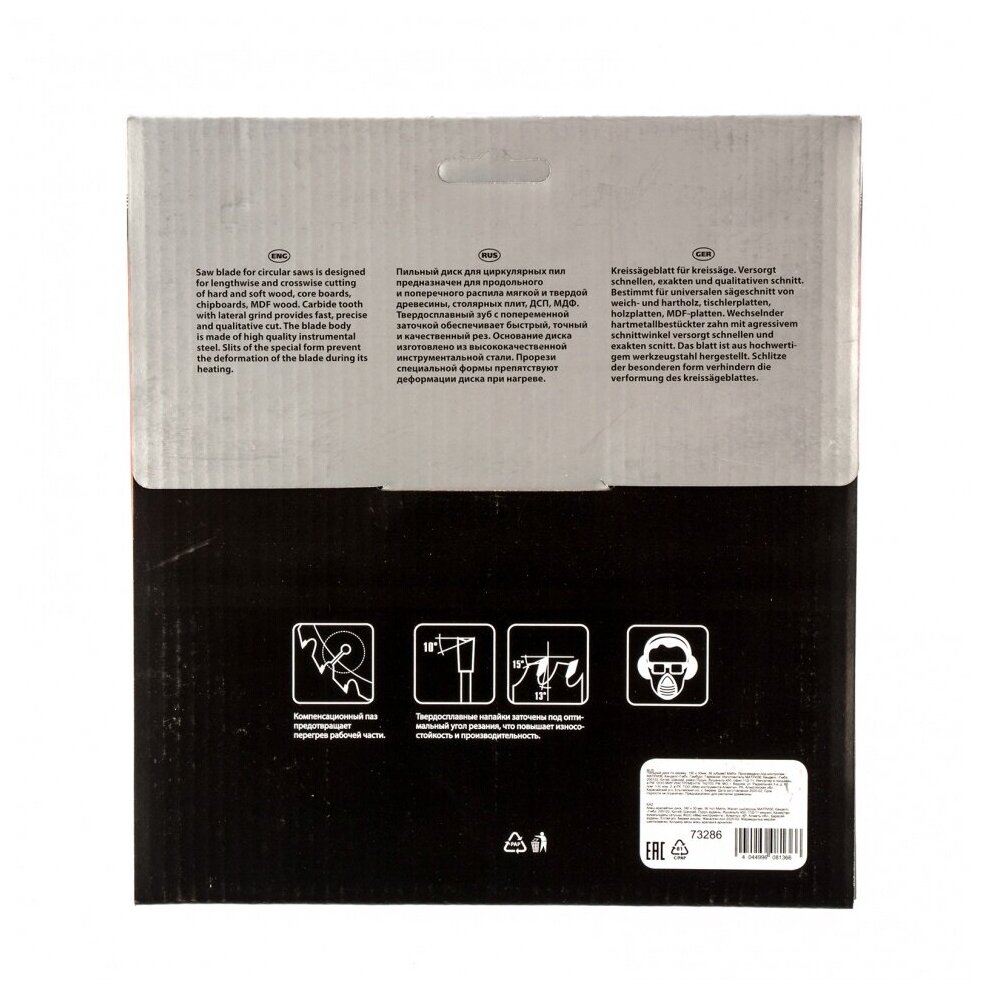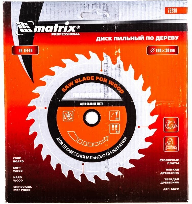 Пильный диск MATRIX Professional произведен с помощью специальная схемы заточки твердосплавных зубьев (ВК4), что позволяет производить качественную распиловку древесины. Компенсационные прорези уменьшают колебания, подавляют шумы и препятствуют изгибанию диска при нагреве.