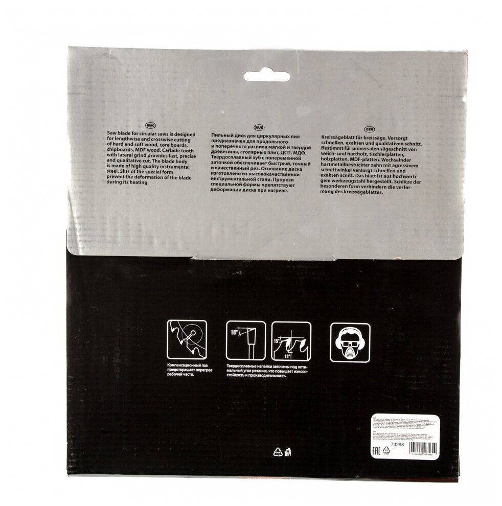 Пильный диск MATRIX Professional произведен с помощью специальная схемы заточки твердосплавных зубьев (ВК4), что позволяет производить качественную распиловку древесины. Компенсационные прорези уменьшают колебания, подавляют шумы и препятствуют изгибанию диска при нагреве.