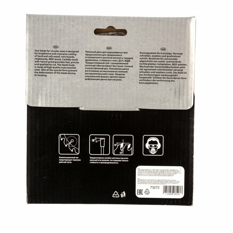 Пильный диск MATRIX Professional произведен с помощью специальная схемы заточки твердосплавных зубьев (ВК4), что позволяет производить качественную распиловку древесины. Компенсационные прорези уменьшают колебания, подавляют шумы и препятствуют изгибанию диска при нагреве.