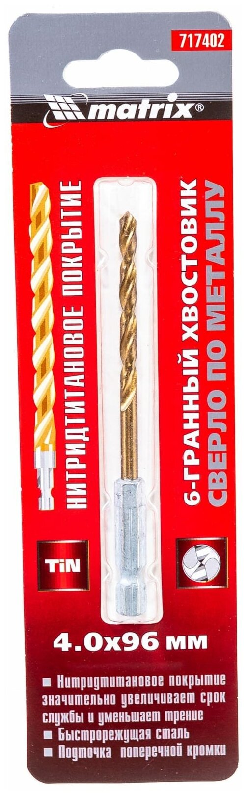 | Прочие особенности и свойства | Сверло по металлу изготовлено из инструментальной легированной стали.,Поверхность сделана из титаносодержащего сплава, что значительно повышает эксплуатационные характеристики сверл по металлу.,Покрытие из нитрида титана увеличивает стойкость инструмента в 2–2,5 раза.,Шестигранный хвостовик предотвращает поворот в патроне. |