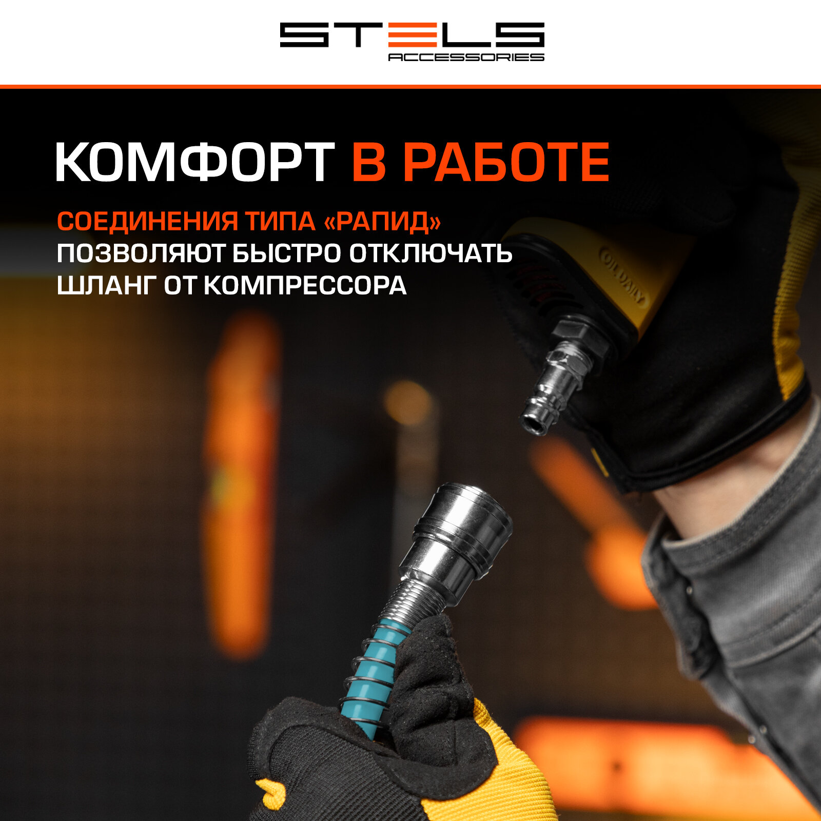 Шланг спиральный воздушный STELS служит удлинителем между компрессором и рабочим инструментом и позволяет осуществлять работы на нужном расстоянии от компрессора. Оснащен фитингами типа "рапид", изготовленными из углеродистой стали с никелевым покрытием. Шланг выполнен из полиэтилена, стойкого к агрессивным средам.