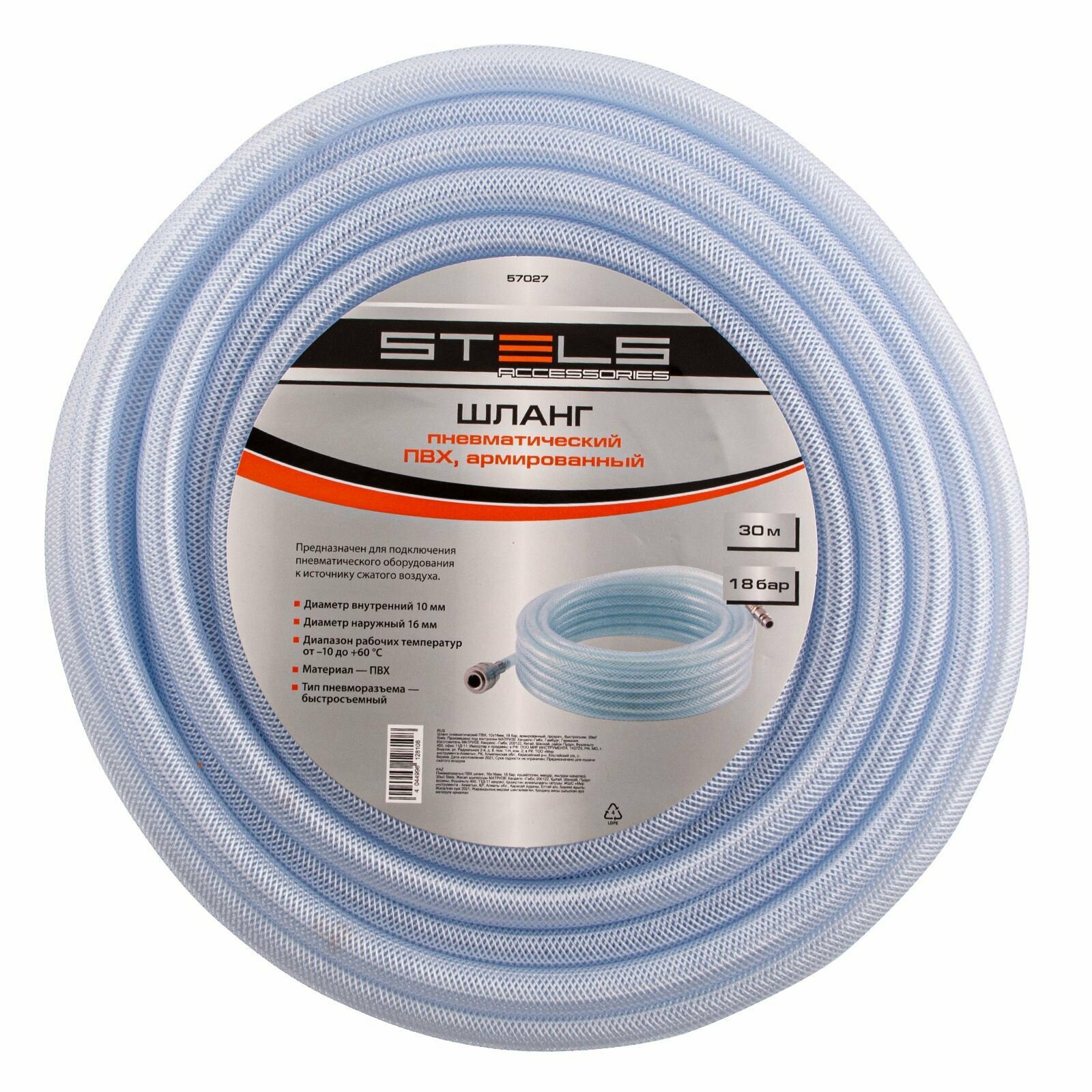 Шланг пневматический ПВХ, 10x16мм, 18 бар, армированный, прозрач., быстросъем , 30м// Stels