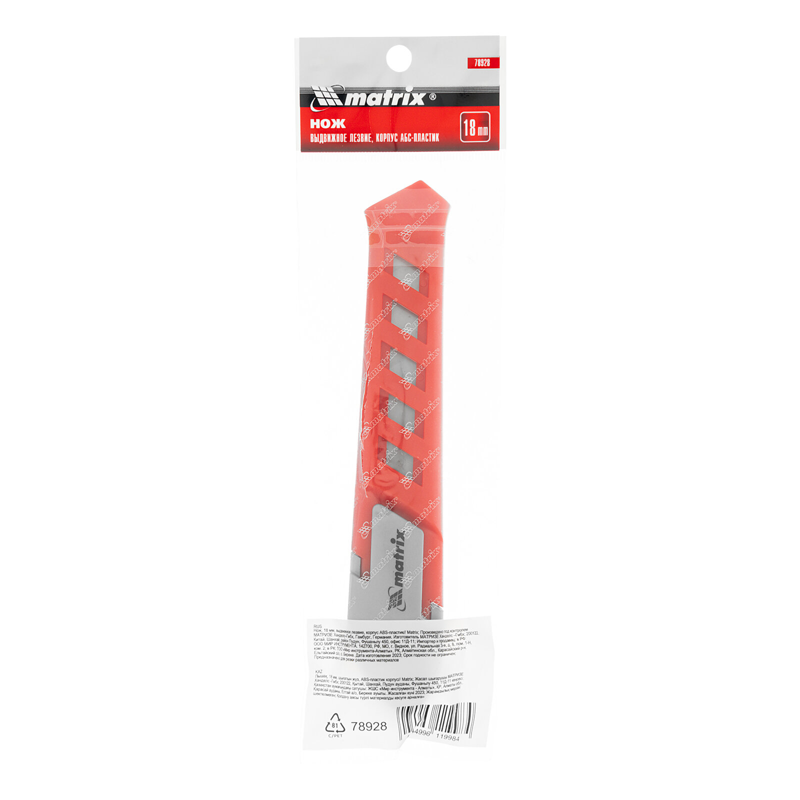 | Прочие особенности и свойства | Нож с выдвижным сегментированным лезвием предназначен для резки различных материалов, таких как бумага, картон, кожа и т.д. Корпус ABS-пластик. |