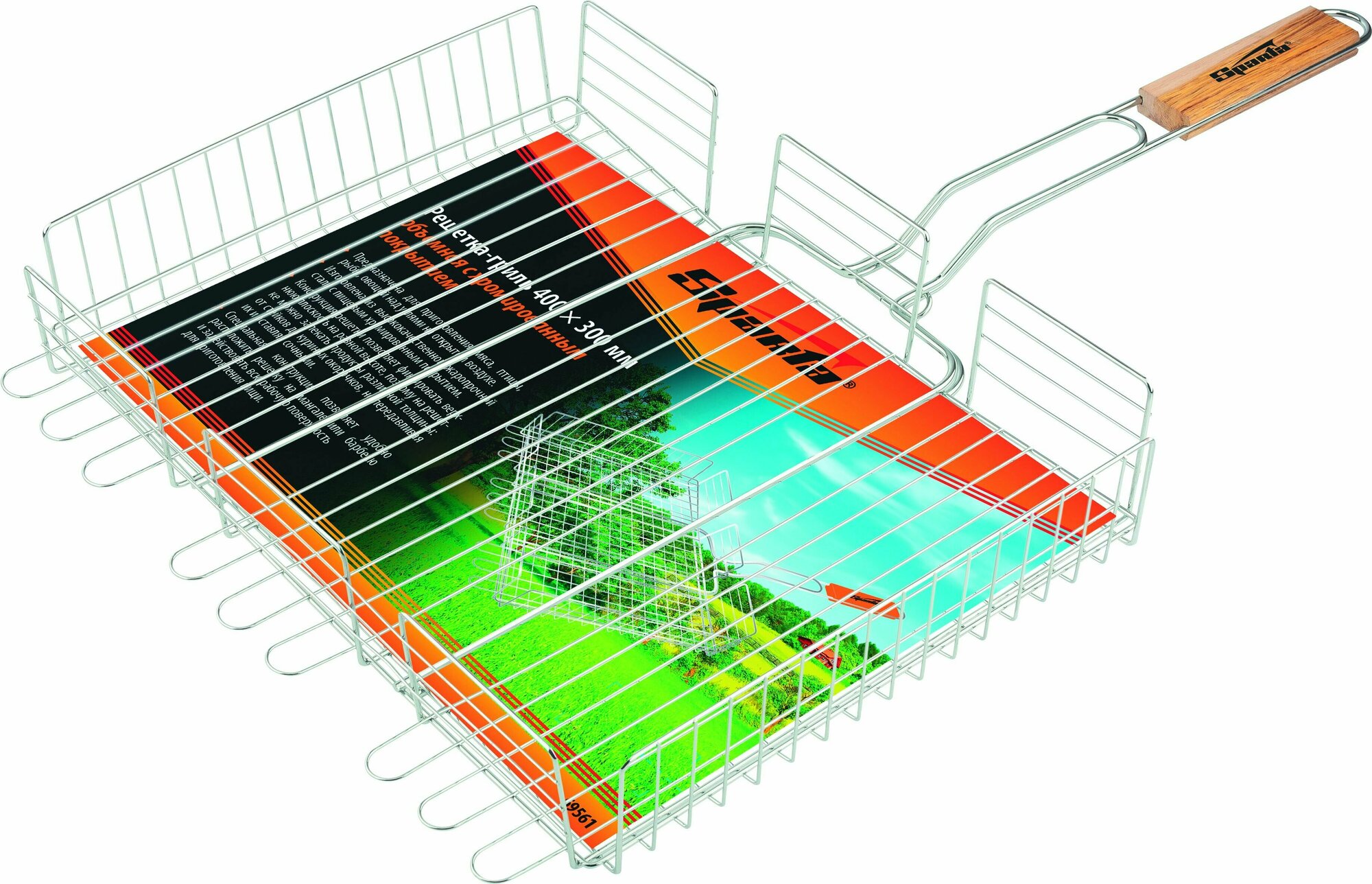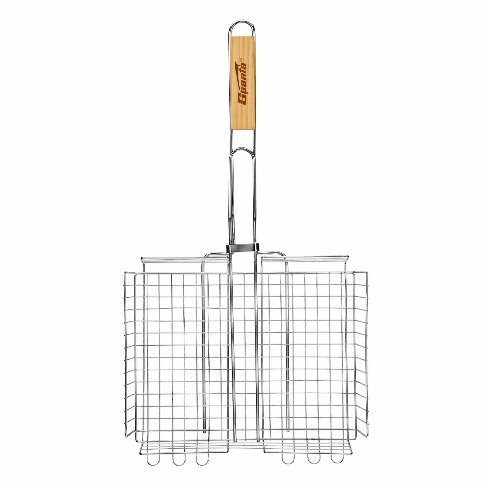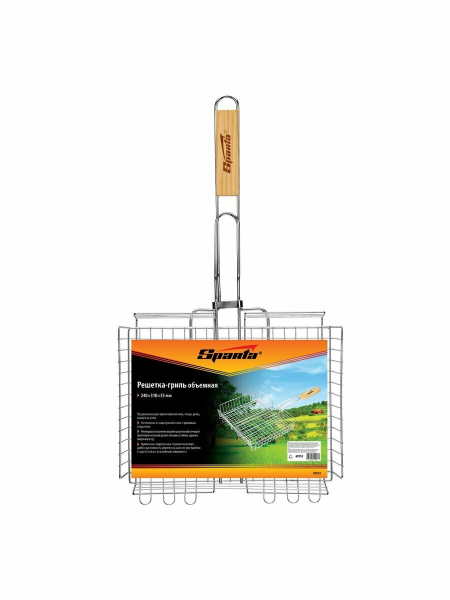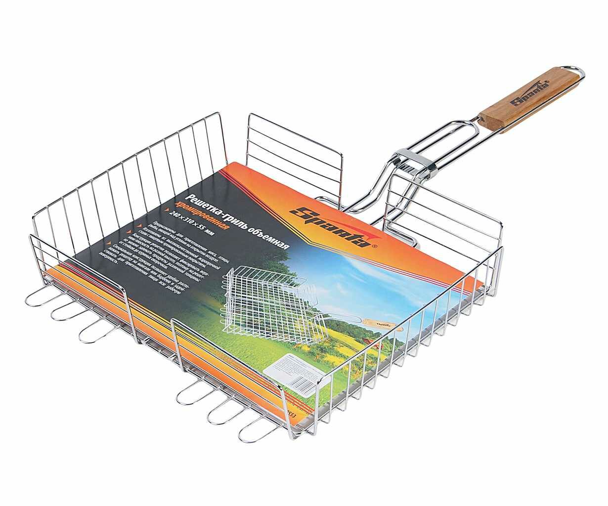 Объемная хромированная решетка-гриль Sparta размером 240 х 310 х 55 мм используется для удобного размещения продуктов и их приготовления на углях. С ее помощью мясо, рыба или овощи обжариваются равномерно с двух сторон, что позволяет получить вкусные блюда. За счет регулировки высоты решетки возможно приготовление продуктов любого размера без потери сока.Преимущества Долговечная конструкция - решетка из высококачественной жаропрочной стали характеризуется прочностью и надежностью. Стойкость к воздействию влаги - хромовое покрытие предотвращает образование ржавчины на жаровне. Безопасное переворачивание - широкое кольцо-фиксатор не допускает случайного раскрытия решеток. Комфортное использование - эргономичная рукоятка выполнена из древесины, приятной на ощупь и не подверженной нагреву. Увеличенные опорные стержни - такое конструкционное решение позволяет использовать площадь решетки полностью, а также обеспечивает ее надежную фиксацию на мангале.