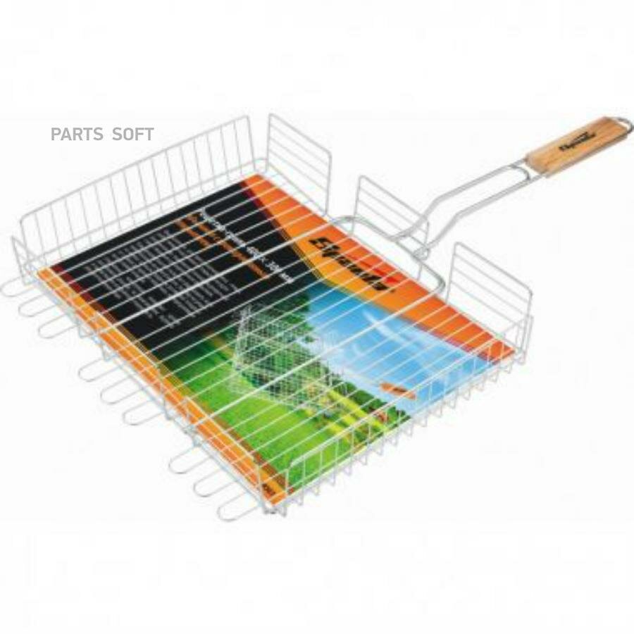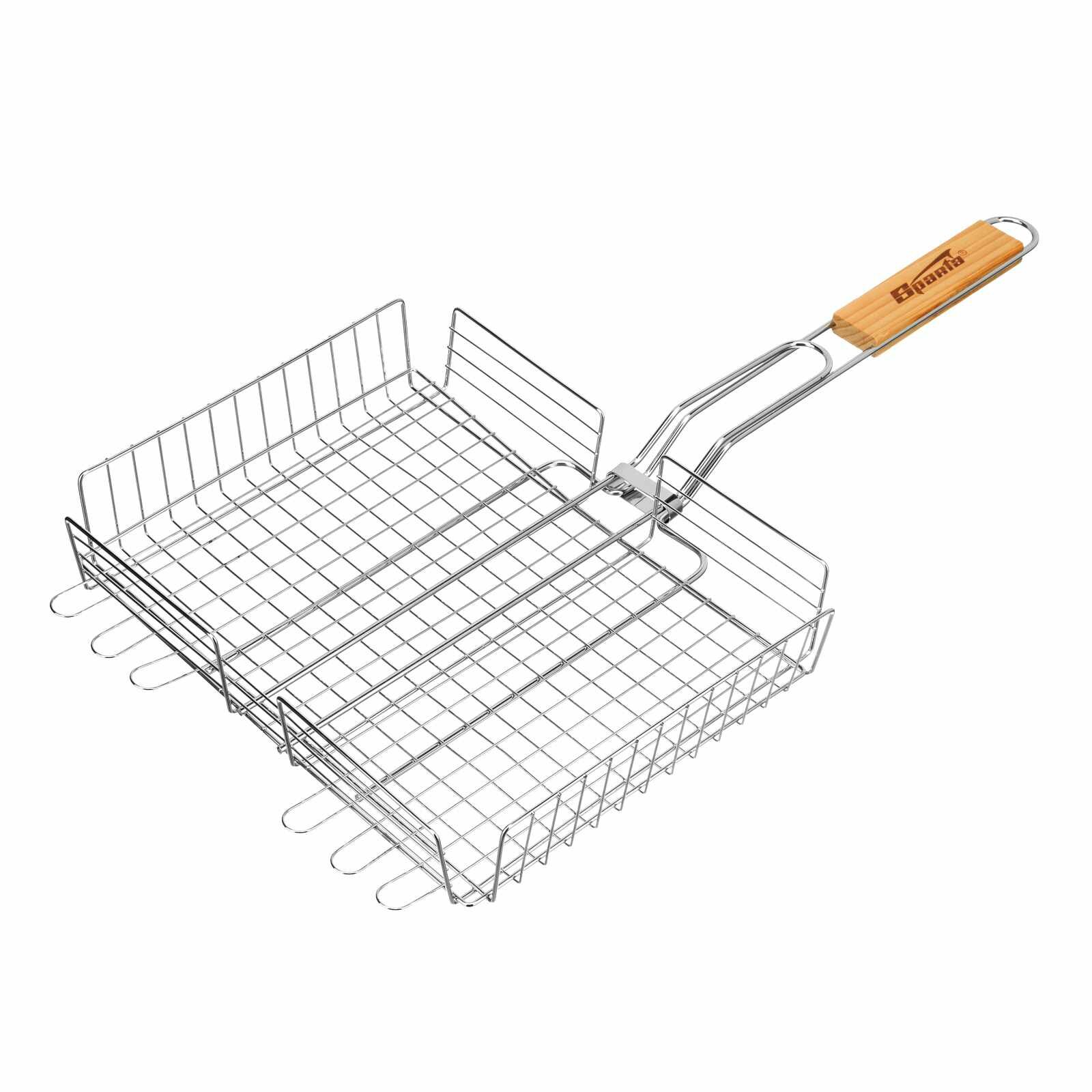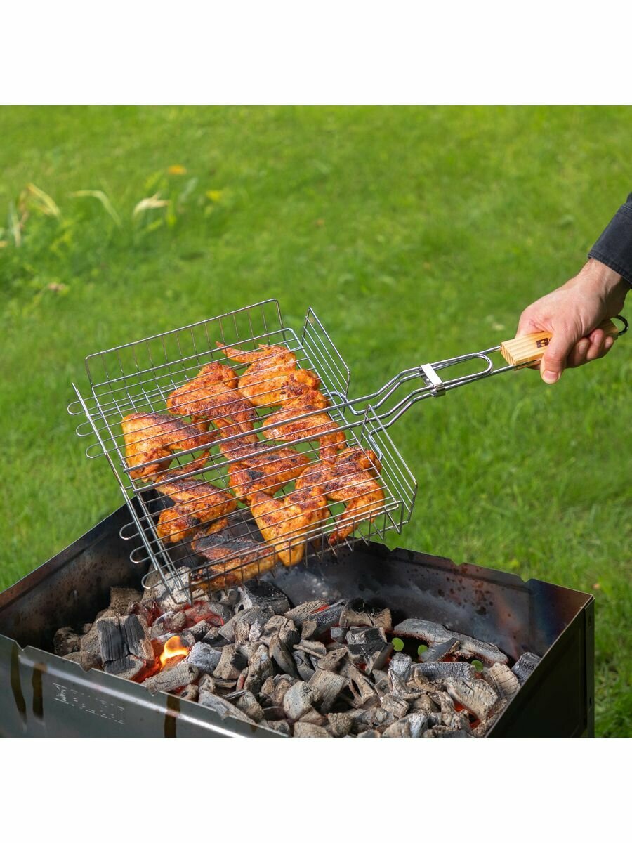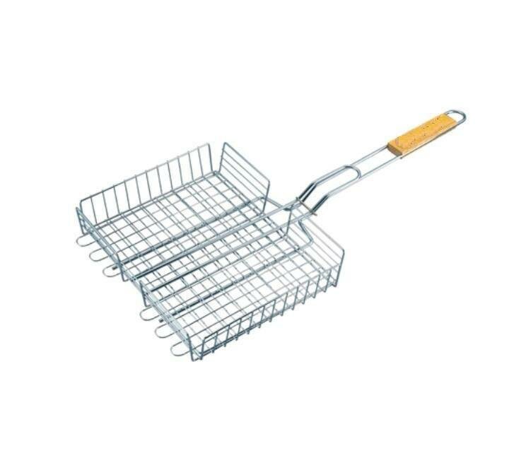 Объемная хромированная решетка-гриль Sparta размером 240 х 310 х 55 мм используется для удобного размещения продуктов и их приготовления на углях. С ее помощью мясо, рыба или овощи обжариваются равномерно с двух сторон, что позволяет получить вкусные блюда. За счет регулировки высоты решетки возможно приготовление продуктов любого размера без потери сока.Преимущества Долговечная конструкция - решетка из высококачественной жаропрочной стали характеризуется прочностью и надежностью. Стойкость к воздействию влаги - хромовое покрытие предотвращает образование ржавчины на жаровне. Безопасное переворачивание - широкое кольцо-фиксатор не допускает случайного раскрытия решеток. Комфортное использование - эргономичная рукоятка выполнена из древесины, приятной на ощупь и не подверженной нагреву. Увеличенные опорные стержни - такое конструкционное решение позволяет использовать площадь решетки полностью, а также обеспечивает ее надежную фиксацию на мангале.