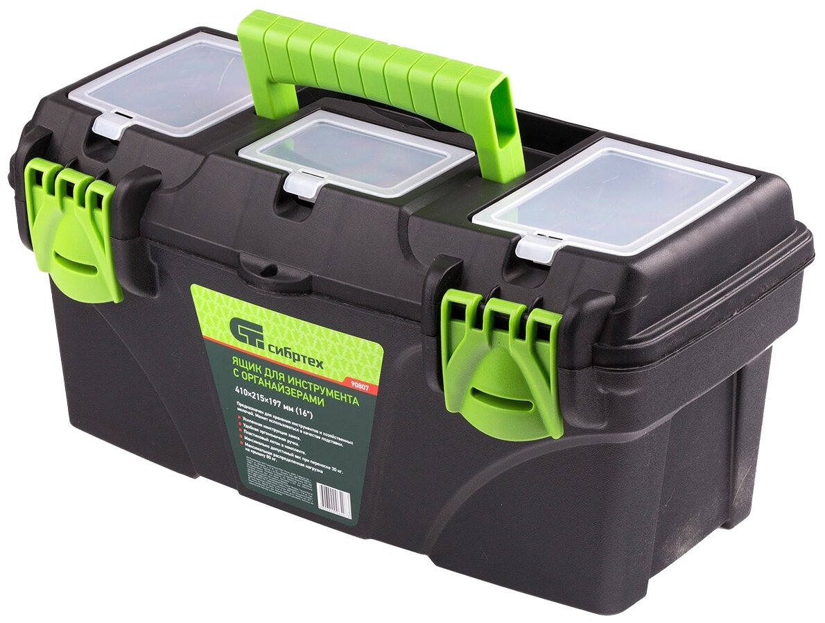 Ящик Сибртех , 16 дюймов, с органайзерами, используется для хранения и транспортировки инструментов, оснастки, крепежей, хозяйственных мелочей и других предметов. Крышка и замок усилены трехрядными петлями, поэтому он выдерживает вес содержимого до 30 кг. Ящик можно брать в поездку, также он пригодится дома, на даче или в гараже.ПреимуществаВ крышке предусмотрены органайзеры, в которых можно рассортировать крепежи и другие мелкие детали.Съемный лоток с ручкой позволяет оптимизировать пространство внутри ящика.Удобная ручка облегчает транспортировку даже максимально заполненного ящика.Ручка утапливается в крышке, поэтому при необходимости ящик может служить подставкой.