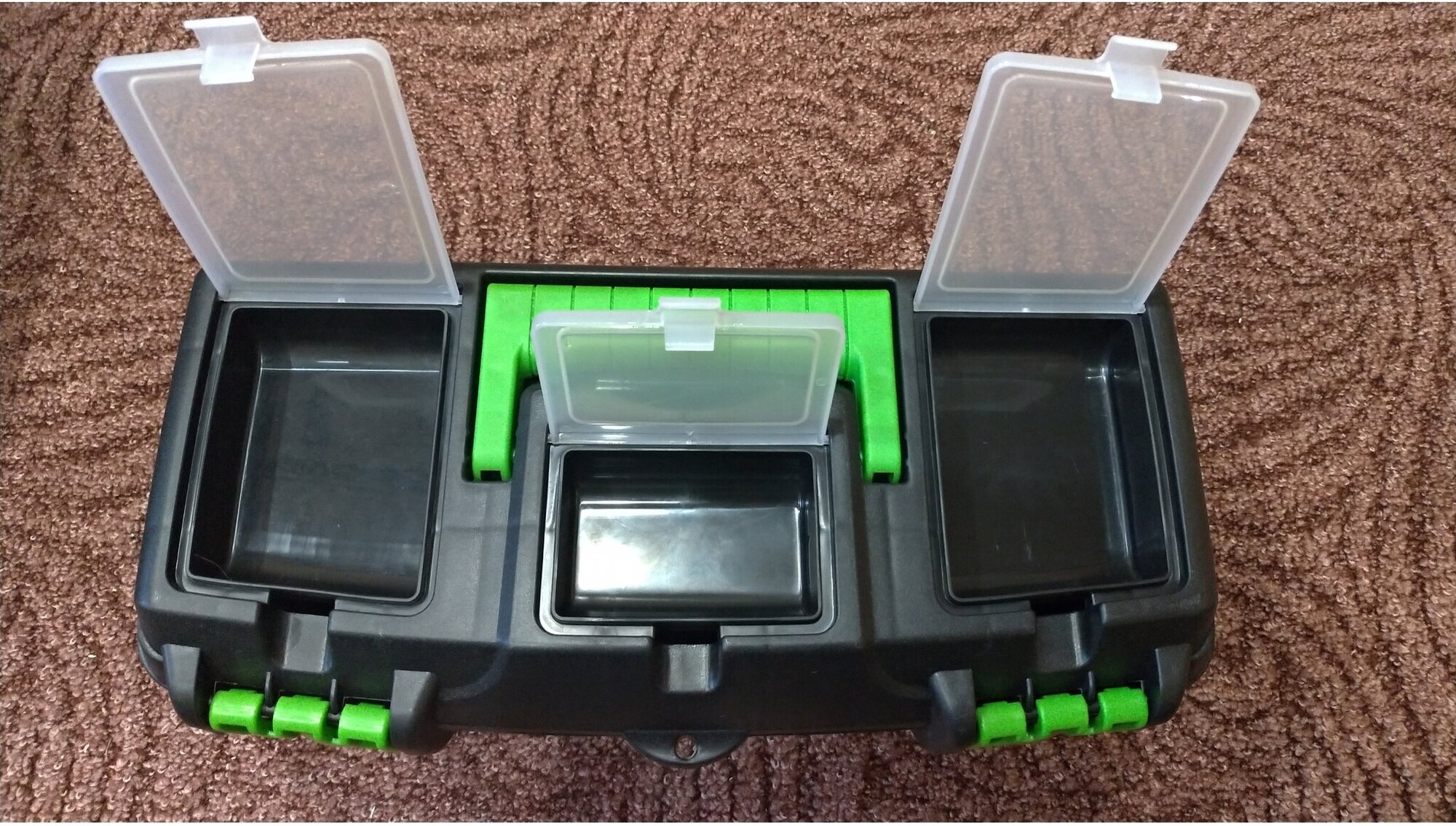 Купил такой ящик более года назад. Ящик неплохой, однозначно своих денег он стоит. на верхней крышке имеются три отсека для хранения мелочи в виде гвоздиков , болтиков, шурупчиков и т.д. Основной отсек очень вместительный, можно положить уже более крупный ручной инструмент в виде болгарки, молотка, плоскогубцев и т.д. Поверх него устанавливается лоток вкладыш. Здесь также может хранится какая-то мелочь, но за счет того, что отдельных закрывающихся отсеков нет нужно быть готовым к тому, что все может перемешаться. Лучше хранить в какой-либо таре. Выдерживает неплохую нагрузку. Внутри обычно переносится порядка 10 кг, ручка не оторвалась пока, замки хорошие, ни разу не подвели и не открылись. Можно смело брать