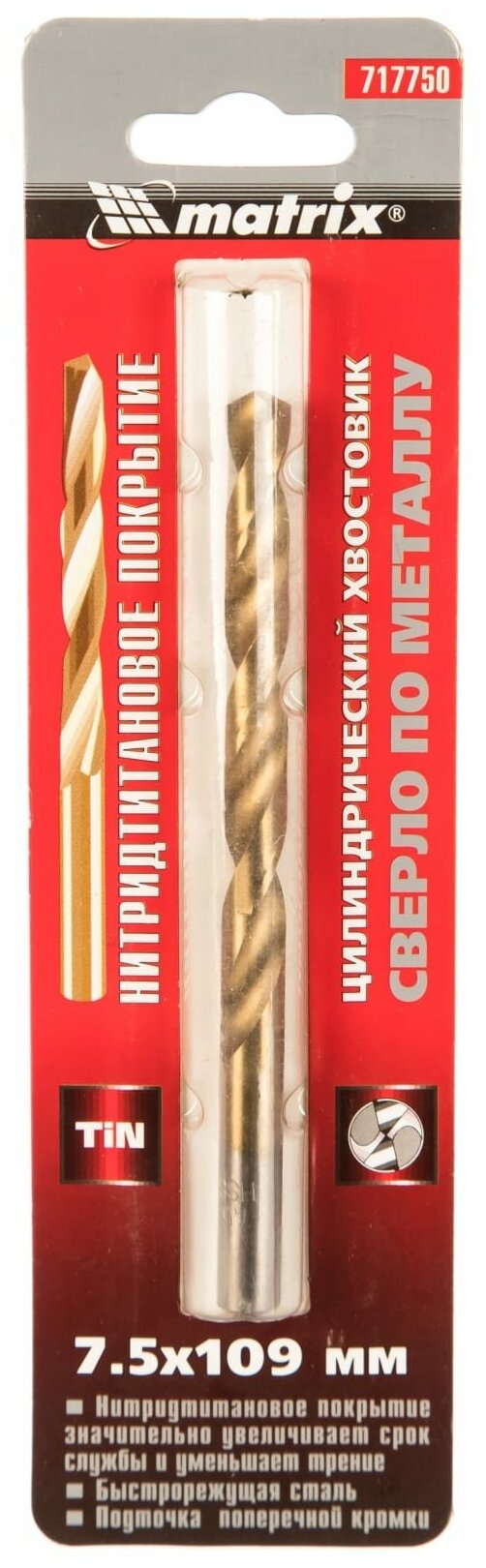 | Прочие особенности и свойства | Сверло Matrix 717750 предназначено для выполнения сквозных и глухих отверстий в легированной и нелегированной стали, сером чугуне, металлокерамическом сплаве на основе железа, ковком чугуне, цветном металле. Сверло изготовлено из инструментальной легированной стали и покрыто нитридом титана. Покрытие позволяет снизить трение во время работы. Оснастка имеет цилиндрический хвостовик. Работает в правом направлении. |