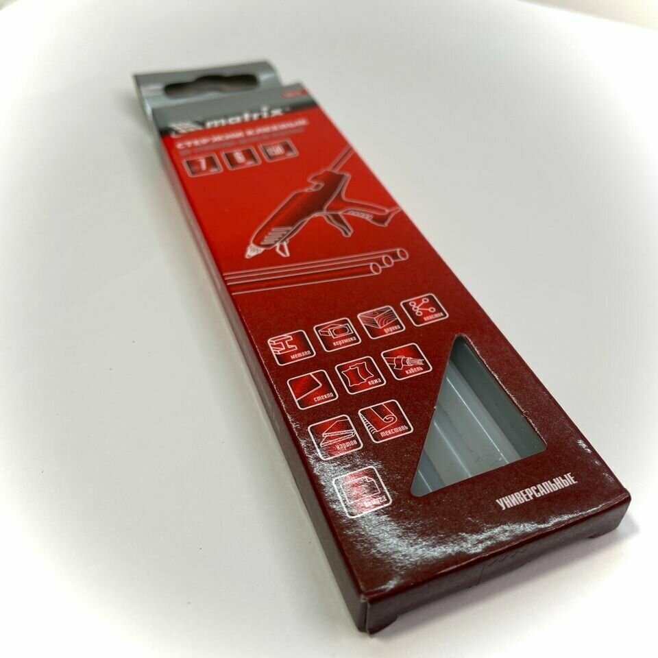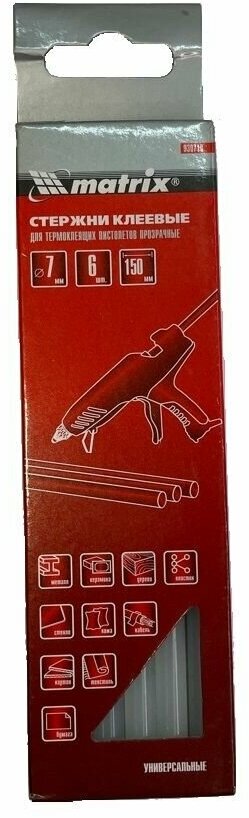 Универсальные клеевые стержни MATRIX предназначены для использования с термоклеящими пистолетами. Применяются для склеивания изделий из дерева, металла, пластика, ткани, кожи, стекла, керамики, бумаги, картона, резины и других материалов. Наилучшая склейка достигается у шершавых, пористых и имеющих высокую адгезию поверхностей. С помощью термоклея возможно создание временной водонепроницаемости при отсутствии сильного давления воды и нагревания (таким образом заделывают трещины в ведрах, садовых лейках, душевых кабинах и др.). Запрещается нагревание с помощью открытого огня и других приспособлений, применение с поверхностями, соприкасающимися с продуктами питания. Во избежание ожогов, запрещено трогать расплавленный клей руками.