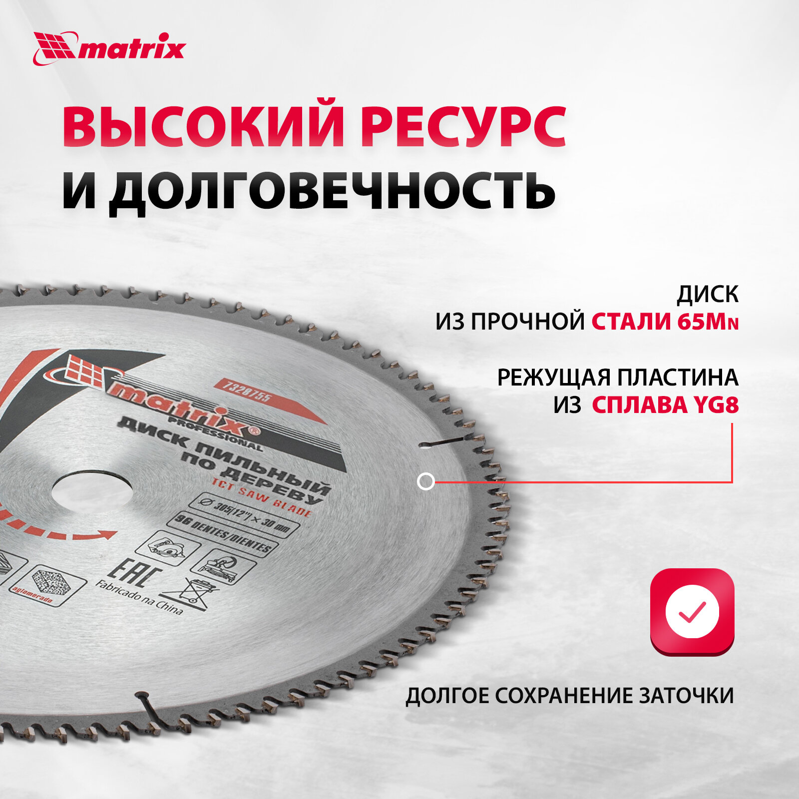 Диски Matrix Professional предназначены для продольного и поперечного распила древесины. Корпус диска шлифованный, изготовлен из стали 65Г и термонормализован. Зубья из ВК8 припаяны высокопрочным припоем. Алмазная заточка с выхаживанием значительно увеличивает срок службы инструмента.