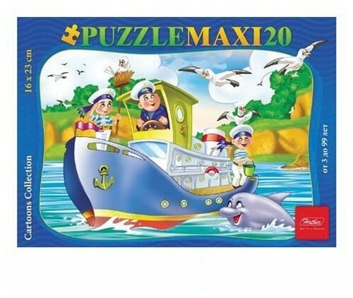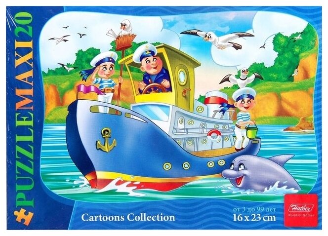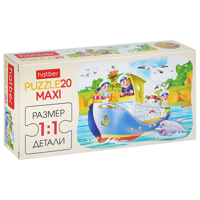 Макси-пазл Кораблик, представленный в серии Cartoon Collection, произведен российской компанией Hatber. В комплекте есть двадцать элементов, которые хорошо крепятся между собой, объединяясь в полноценное насыщенное изображение с корабликом, плавающим в море. Собранную картинку можно склеить и поставить в рамочку (нет в комплекте). Рекомендован детям старше 3 лет.