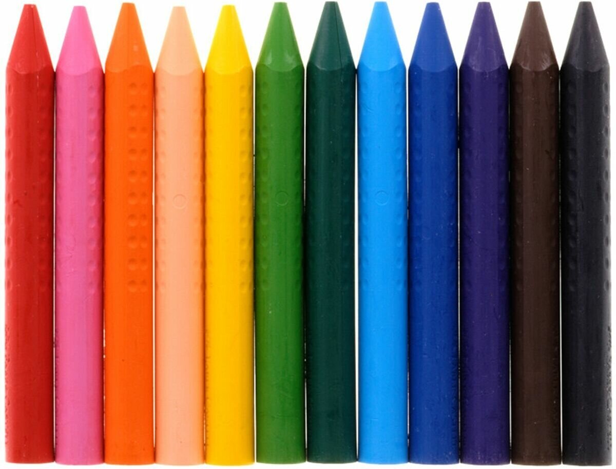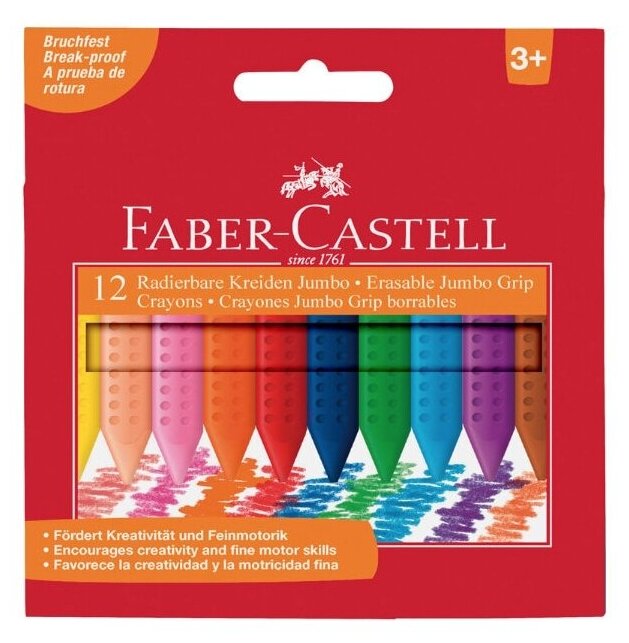 Карандаши восковые 12цв Faber-Castell Jumbo GRIP трехгранные, стираемые 122540 поможет организовать ваше рабочее пространство и время. Востребованные предметы в удобной упаковке будут всегда под рукой в нужный момент. Карандаши имеют удобную эргономичную трехгранную форму,легко стираются ,не пачкают руки - удобны для маленьких детей старше 3-х лет.