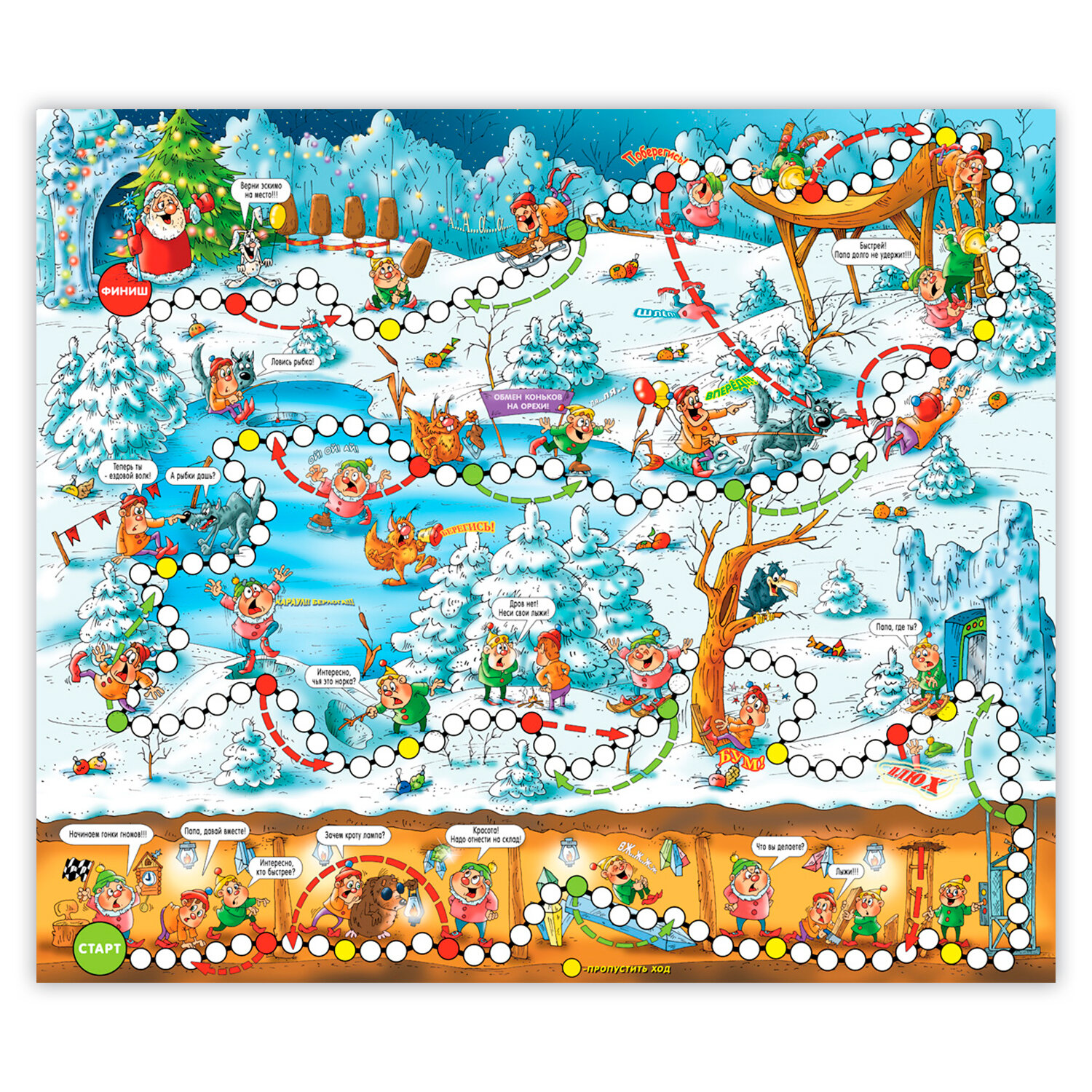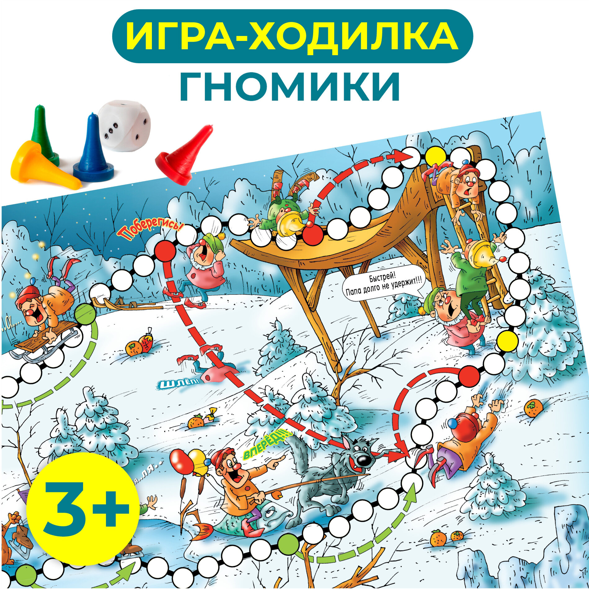 Игра-ходилка Гномики - это классическая игра-ходилка с новым сюжетом и яркими картинками. Компания друзей весело и познавательно проведет время вместе, когда совершит захватывающее путешествие вместе с гномиками на земле и под землей. Играть можно вдвоем или в компании друзей до 4 человек. Для начала необходимо выбрать фишки и поставить их на старт. Далее каждый по очереди бросает кубик и делает столько ходов, сколько очков выпало. Выигрывает тот, кто первый дойдет до финиша. Игра направлена на развитие эмоций ребенка и умения общаться с другими детьми. Кроме того, развивает координацию движений и логическое мышление. В набор входит 4 фишки, кубик и игровое поле.