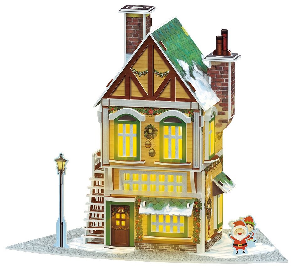 Вы уже готовый к наступлению самого долгожданного праздника в году? Поможет почувствовать атмосферу волшебства и украсит комнату юного любителя приключений этот замечательный конструктор-головоломка от Cubic Fun. У Вашего ребенка получится красочный детализированный домик, который немного припорошило снегом. Все здесь готово к встрече Нового Года! Даже добрый Дедушка Мороз с большим мешком подарков уже ожидает у крыльца. Конструктор состоит из 81 детали, которые изготовлены из бумаги и пены EPS, для его сборки не требуются инструменты и клей. Набор имеет 5-й уровень сложности, он станет отличным подарком для детей от 7-9 лет. Детали очень просто выдавливаются из картона и соединяются между собой с помощью специальных приспособлений. А еще макет оснащен световыми эффектами, что придает ему по-особенному чарующий облик. Для работы подсветки требуются 2 батарейки типа АА / LR6.