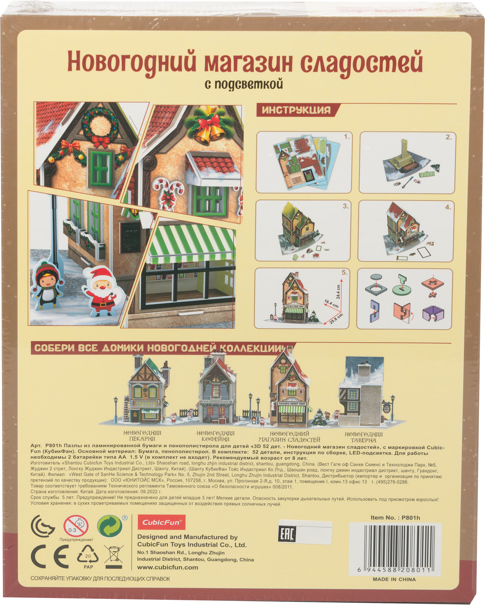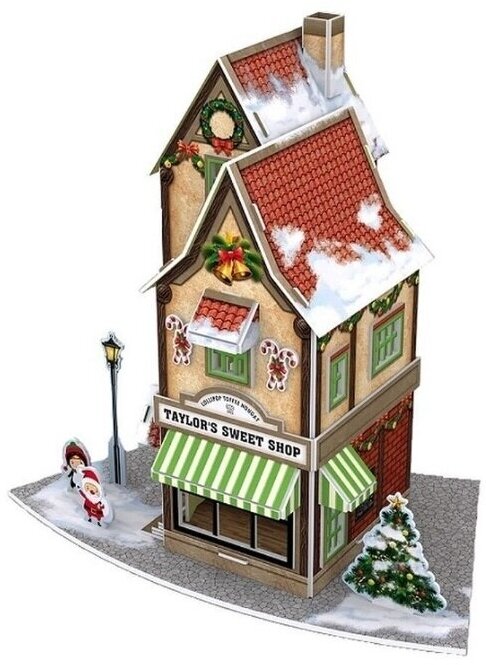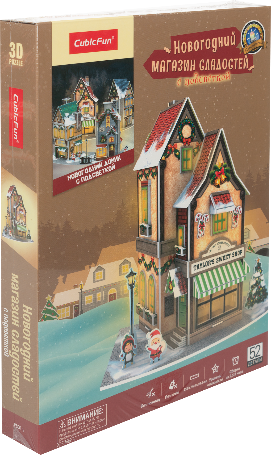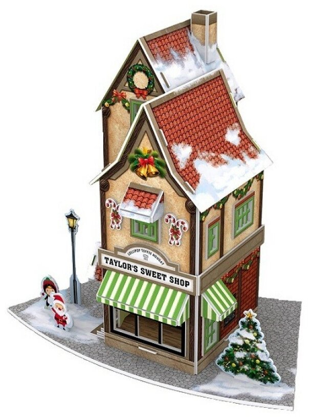 Почувствовать атмосферу приближающего праздника так легко с красочным конструктором-головоломкой от Cubic Fun. Маленький любитель приключений сможет собственными руками соорудить уютный магазинчик с рождественскими сладостями, где, наверняка, сам Дедушка Мороз уже упаковывает подарки для детишек. Сооружение получится очень красивым и реалистичным. Окошки украшены гирляндами, колокольчиками и конфетами, а у крыльца стоит наряженная ёлка. Конструктор состоит из 52 деталей, которые изготовлены из бумаги и пены EPS, для его сборки не требуются инструменты и клей. Набор имеет 4-й уровень сложности, он станет отличным подарком для детей от 7-9 лет.Детали очень просто выдавливаются из картона и соединяются между собой с помощью специальных приспособлений. А еще макет оснащен световыми эффектами, что придает ему по-особенному чарующий облик.
