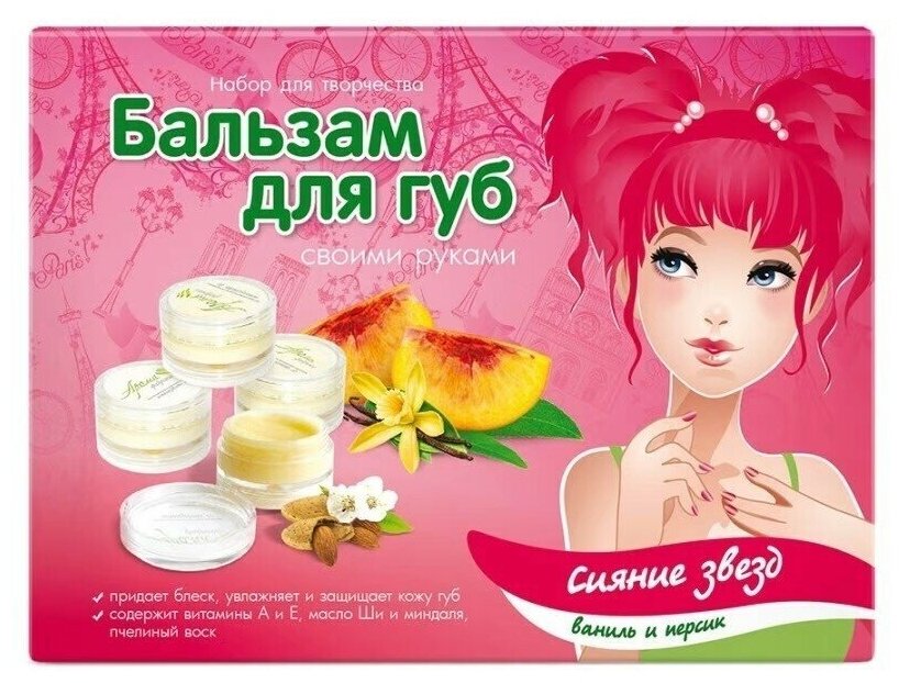 | Состав набора | ароматизаторы пищевые, 2 шт (ваниль, персик), масло миндаля (косметическое), воск пчелиный, масло Ши, витамины А и Е, емкость для перемешивания, палочки для перемешивания, перчатки, баночки под готовый бальзам, 4 шт, наклейки, инструкция |