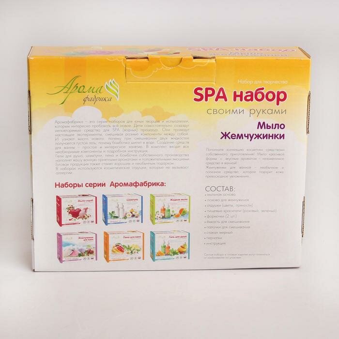 | Состав набора | мыльная основа,основа для жемчужинок,отдушки (цветы, пряности),пищевые красители (розовый, зеленый),формочки (2 шт),ёмкость для смешивания,палочки для смешивания,стакан мерный,перчатки,инструкция |
