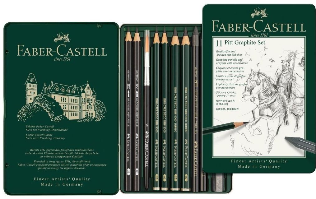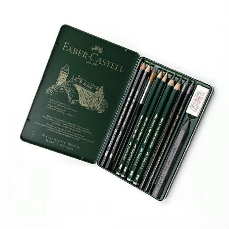 Набор графитный Pitt Monochrome от немецкой торговой марки Faber-Castell из 11 предметов представлен в металлической коробке, и состоит из карандашей Castell 9000 и графитных карандашей Pitt Monochrome с дополнительными принадлежностями, пригоден для начинающих художников, соответствует профессиональным стандартам. Иготовлены карандаши из натурального кедра.