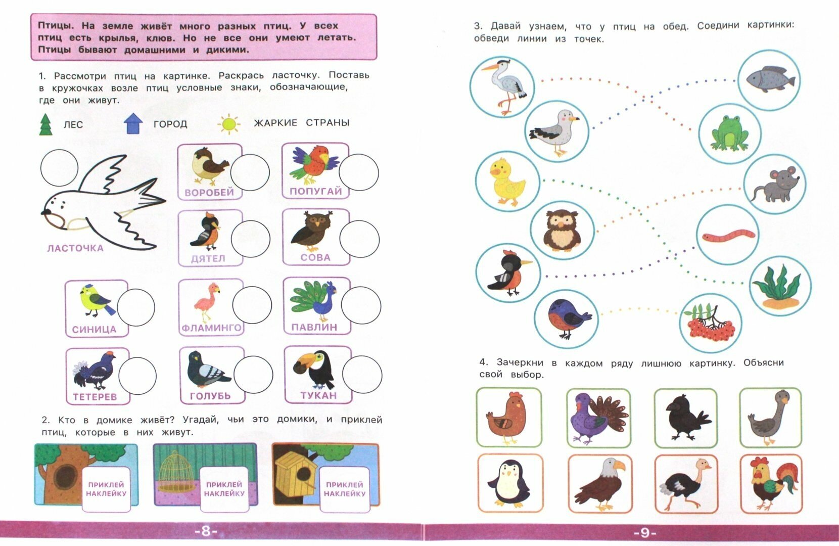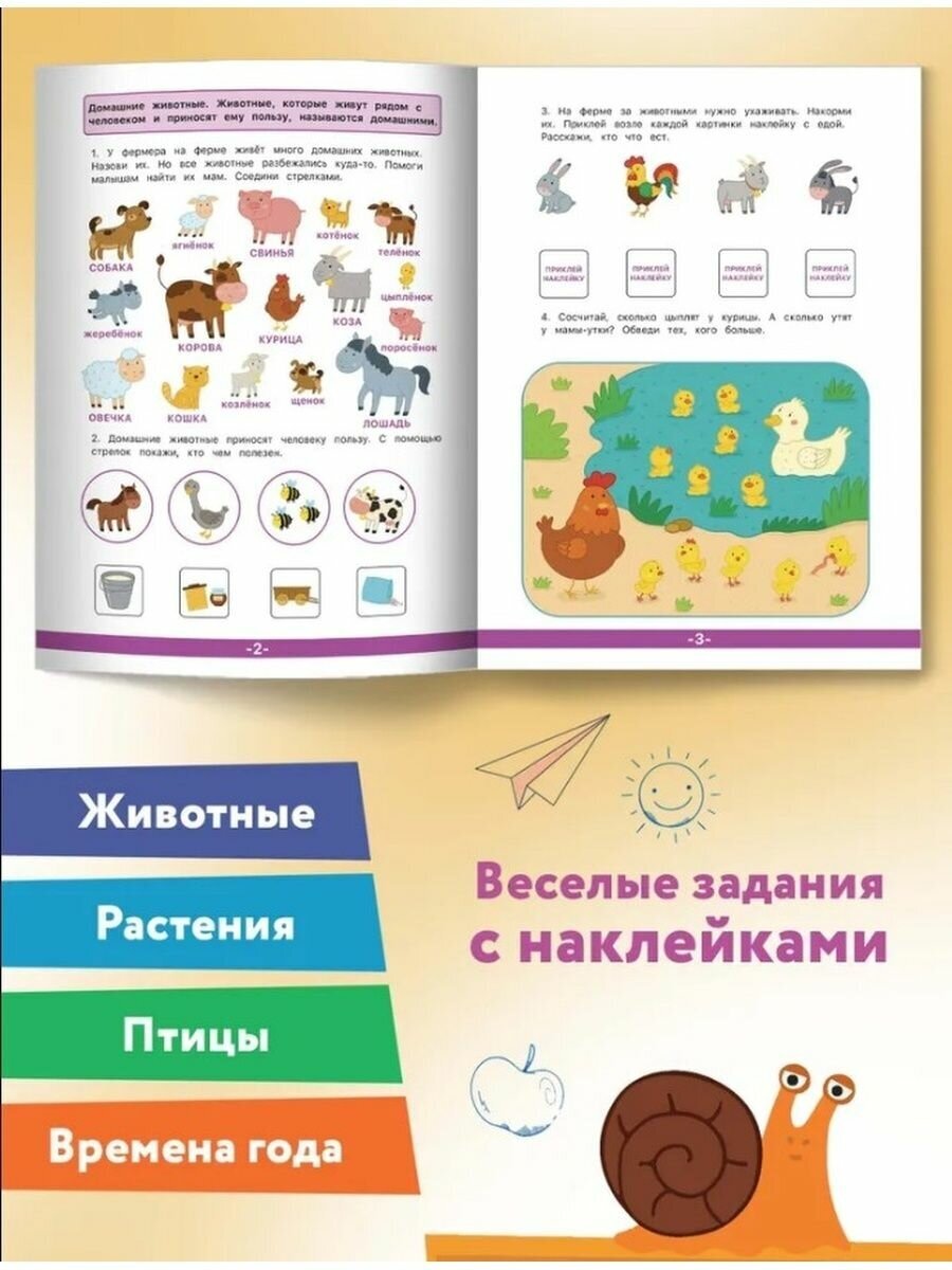 Книжка хорошая, задания разнообразные для изучения окружающего мира: раскрасить, сравнить, накормить животных, посчитать, кто где живет. Очень много интересных, полезных заданий на 16 страницах плюс пол листа наклеек. Очень симпотично нарисованы животные, в отличие от многих других рисованных книжек. Ребенку 2 года, не все задания нам по возрасту, но есть чем позаниматься и нам.
