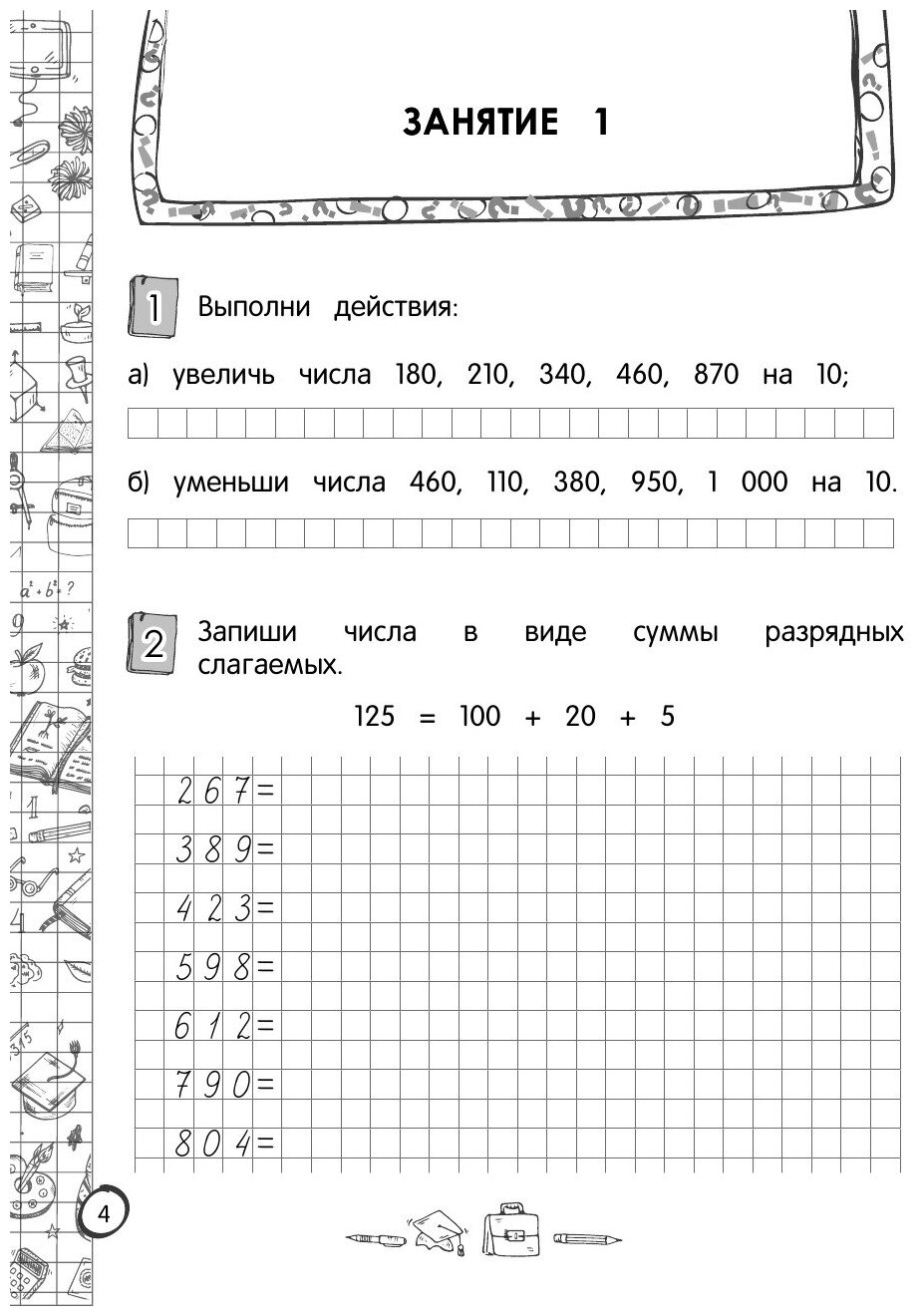 Пособие, соответствующее ФГОС, направлено на развитие математических способностей, систематизацию и углубление знаний по предмету, тренировку и закрепление навыков счёта, понимание и решение примеров, задач. Каждое занятие содержит 5 разноуровневых заданий, выполняя которые ребёнок разовьёт логику и математическое мышление, внимание и память. Книга адресована учащимся 4-го класса, педагогам и родителям и может использоваться как для индивидуальной работы, так и в качестве дополнительного материала на уроках математики.
