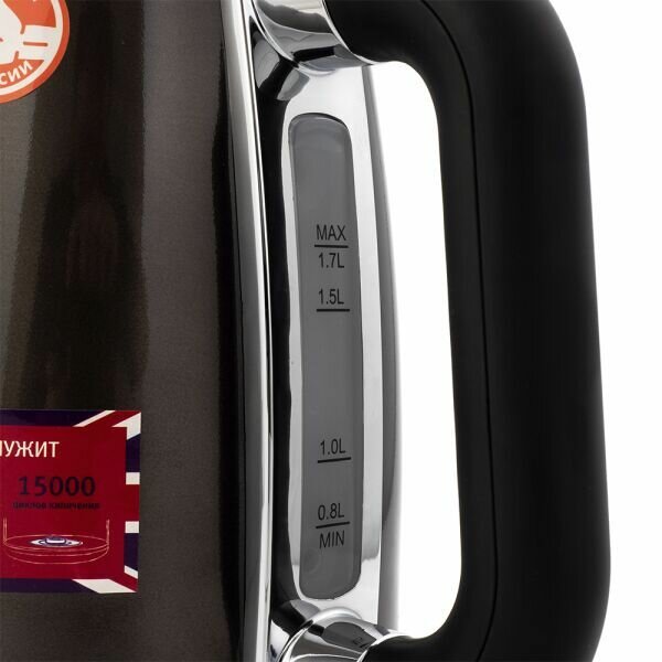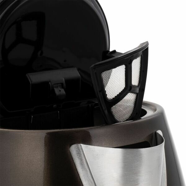Корпус с объемом резервуара 1,7 л выполнен из нержавеющей стали с цветным коричневым покрытием и дополнен внизу широкой хромированной полосой с декоративными насечками. Для комфортного использования ручка изготовлена из пластика, который не нагревается. Тонкий носик с фильтром не пропускает накипь и мелкие частицы, которые содержатся в водопроводной воде.