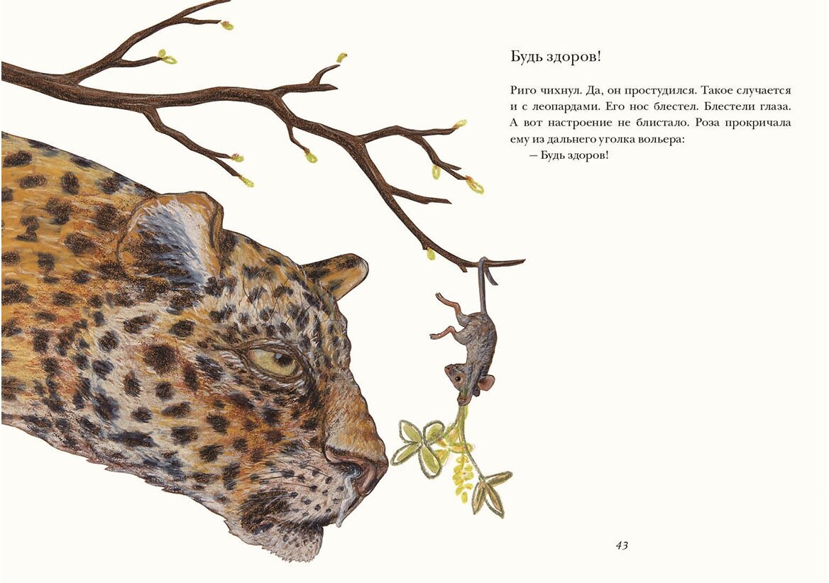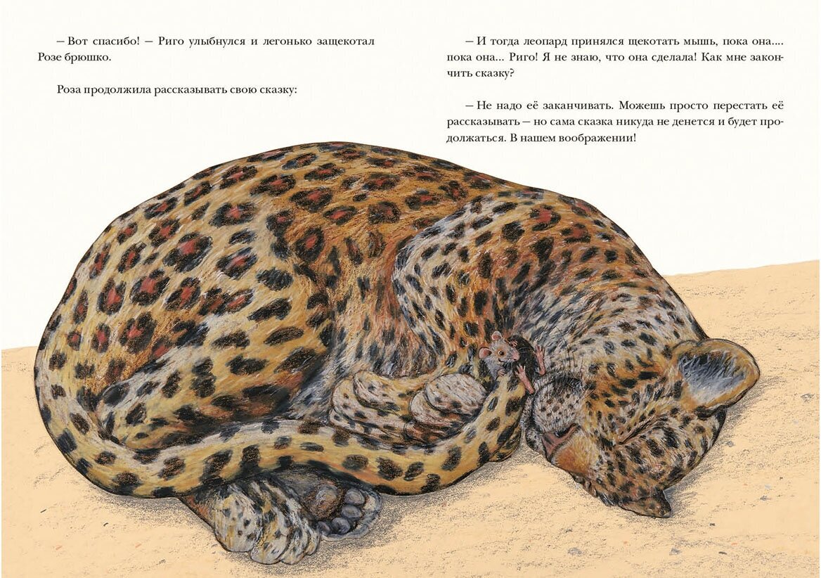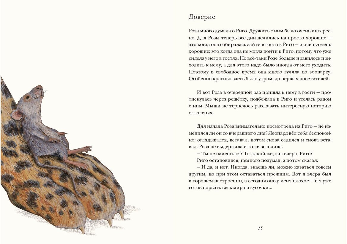 Истории о дружбе мыши и огромной кошки – не в смысле больших размеров, а в смысле леопарда. С одной стороны, литература любит эдакие противопоставления о притянутых противоположностях и идея кажется вторичной еще на входе. Но не торопитесь делать выводы, потому что 28 сказок из жизни Риго и Розы прекрасны сами по себе, вне теорий об их происхождении и резонов автора. Действительно, стоит ли нам размышлять, почему не воробей и крокодил, а именно мышь и леопард, если главное не это. Риго и Роза дружат, помогают друг другу лучше понять себя и других, отвечая на незаданные вечные вопросы о любви и дружбе. Если не хочется копать вглубь, воспринимайте эту книгу просто как хорошо написанные рассказы, в меру забавные, ненавязчиво поучительные, милые достаточно, чтобы понравиться девочкам, но не настолько приторные, чтобы не подойти мальчикам.