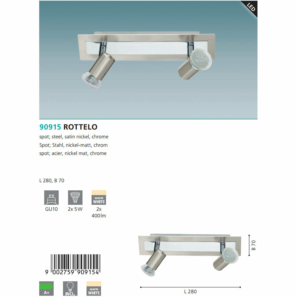 Спот Rottelo - продукт известной компании Eglo (Австрия). Имеет максимальную мощность 10 Вт, освещает площадь до 5 кв. м. Отлично подойдет для таких мест, как кафе, кухня. Впишется в интерьеры следующих стилей: современный.