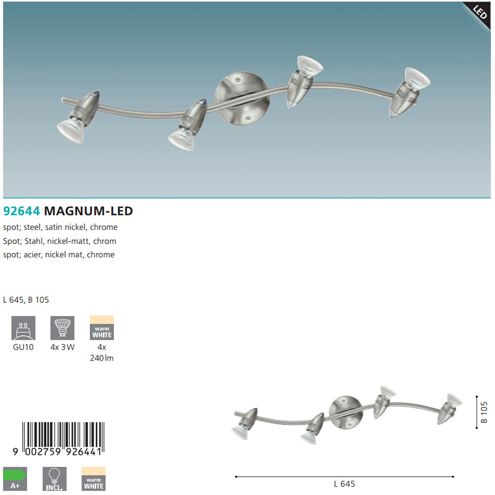 Спот Magnum - продукт известной компании Eglo (Австрия). Имеет максимальную мощность 12 Вт, освещает площадь до 6 кв. м. Отлично подойдет для таких мест, как кафе, кухня. Впишется в интерьеры следующих стилей: современный.
