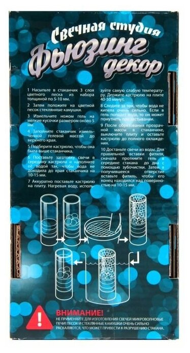 Создать своими руками неповторимую гелевую свечу с цветным песком и стеклянными радужными камушками можно в наборе для творчества Фьюзинг декор из серии Свечная студия. Гель сварен из натуральных и гипоаллергенных компонентов. Дизайнерская гелевая свеча — отличный подарок для близких и друзей. Также она станет интересным и эффектным дополнением к интерьеру.