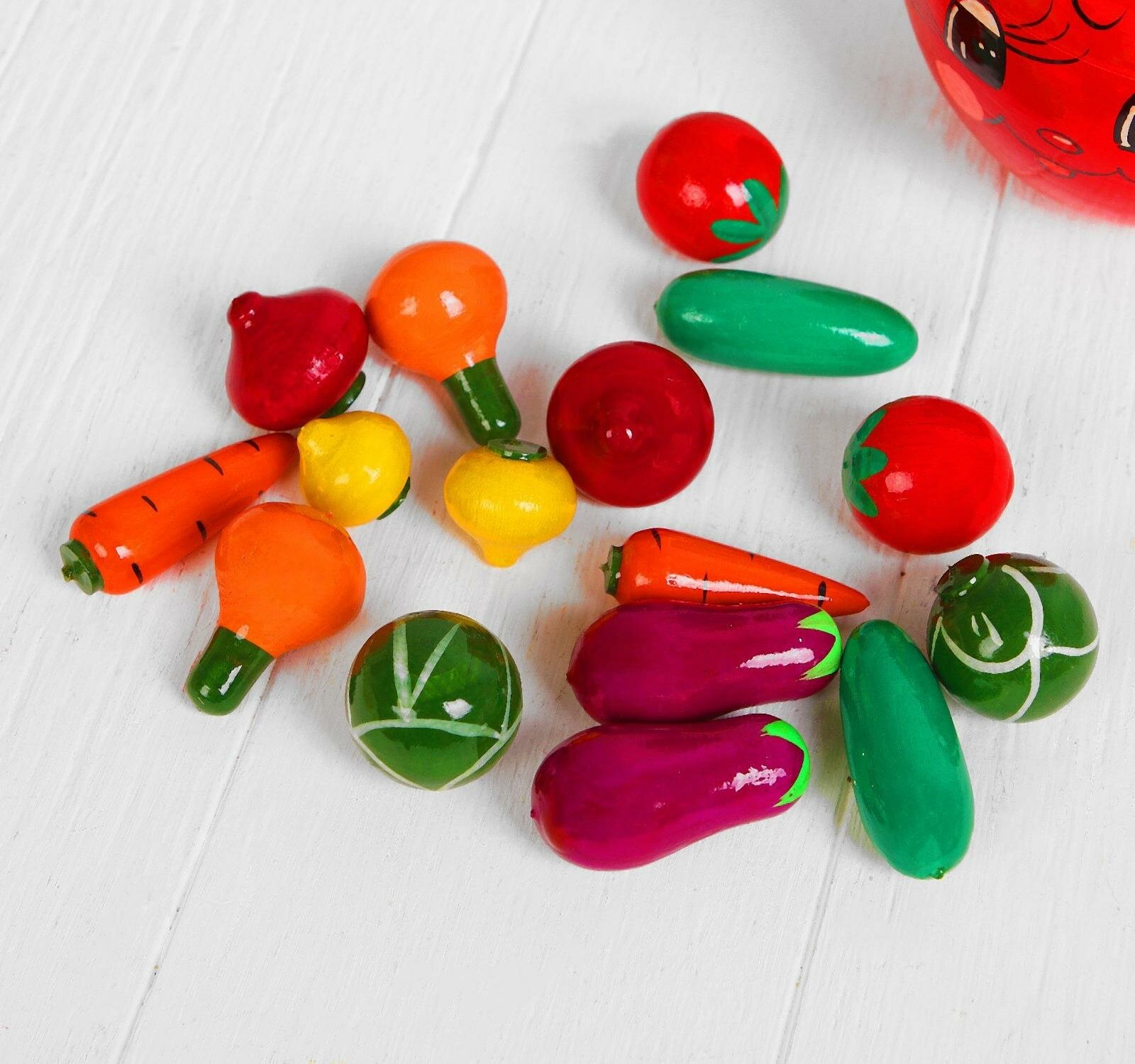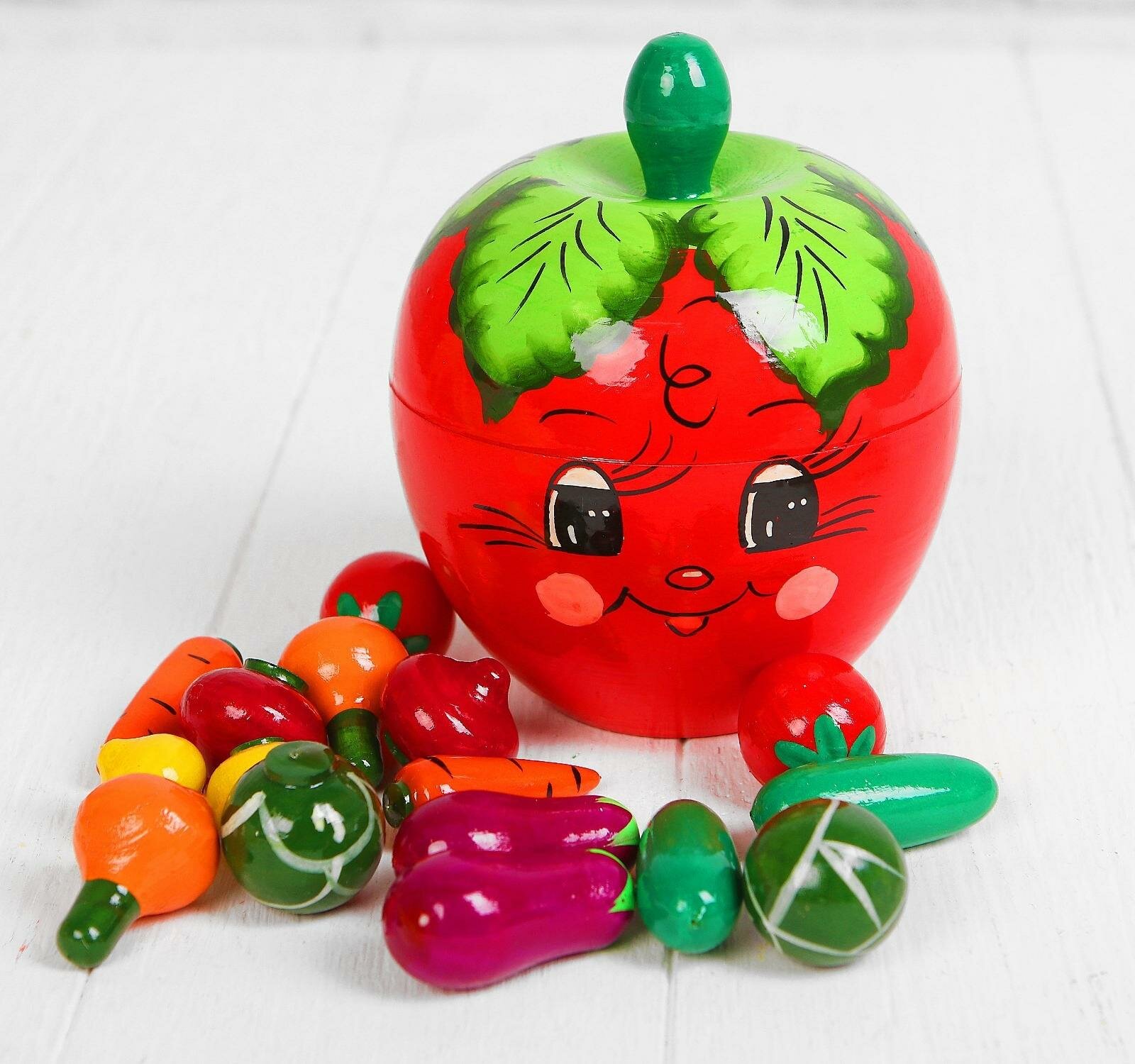 Развивающий игровой набор «Счетный материал: В яблоке» представляет собой деревянные игрушечные овощи, которые помещены в большой красивый контейнер в виде помидора. Игрушки предназначены как для игр, так и обучения - при их помощи малыш может научиться считать, складывать и вычитать, а также различать цвета и запоминать названия овощей. Набор сделан из отлично отшлифованного дерева и покрашен нетоксичными красителями.