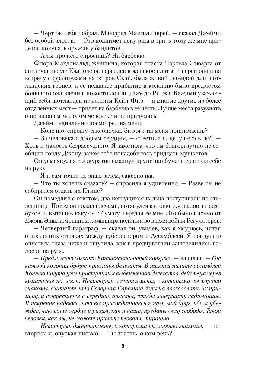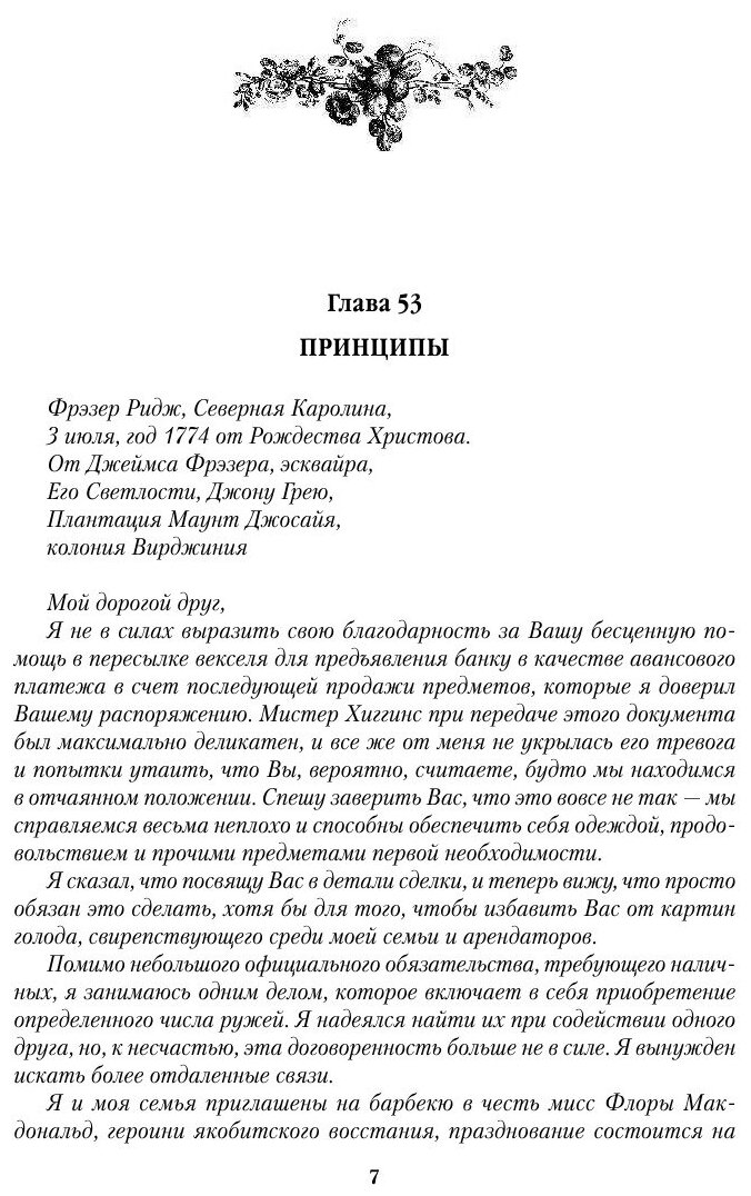 Благодаря жене Джейми знает, что через год случится непоправимое, и тот, кто останется верен королю, будет либо мертв, либо отправится в изгнание. Но Фрэзеров поджидает еще одна опасность: газетная вырезка, датированная 1776 годом, сообщает о гибели Джейми от пожара в собственном доме.