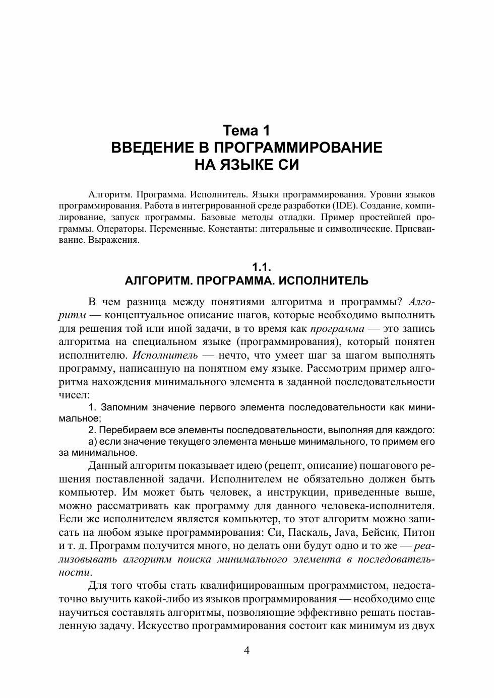 Пособие посвящено основам программирования на языке Си. Рассмотрены такие темы, как: базовый синтаксис, логические и арифметические выражения, основные конструкции структурированных языков программирования (последовательное выполнение, ветвление, циклы), функции, массивы (одномерные и многомерные), символы и строки, типы данных, косвенный доступ к памяти через указатели, ввод/вывод, работа с файлами. В конце каждой главы приведены упражнения для закрепления материала.