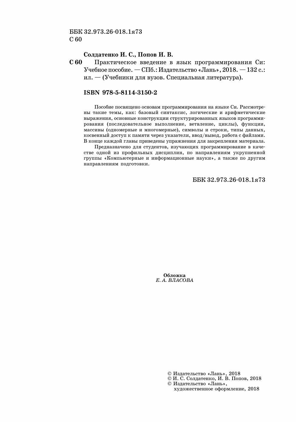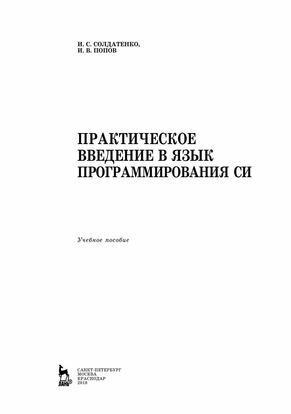 Практическое введение в язык программирования Си. Учебное пособие (Солдатенко Илья Сергеевич, Попов Иван Владимирович); Лань, 2018