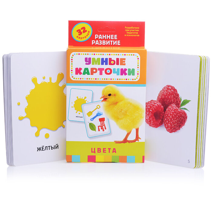 Умные карточки - это уникальные комплекты игр и заданий, направленные на развитие интеллекта, речи, памяти, внимания, образного и логического мышления. Набор «Цвета» состоит из 32 больших карточек: 4 карточки с инструкцией и правилами игр, 7 основных карточек-клякс с изображением цветов и 21 двусторонняя карточка с предметами. Игры с карточками помогут ребенку выучить цвета, а родителям - интересно провести занятие с малышом.