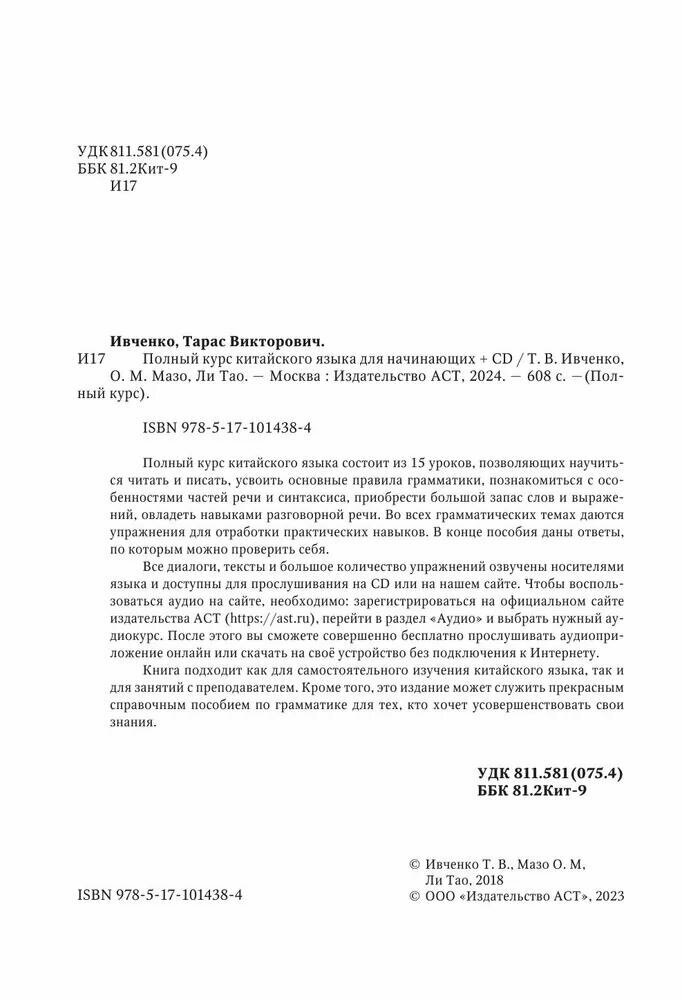 Полный курс китайского языка для начинающих (+CD) (Ивченко Тарас Викторович, Мазо Ольга Михайловна, Ивченко Тарас Викторович); ООО "Издательство Астрель", 2020