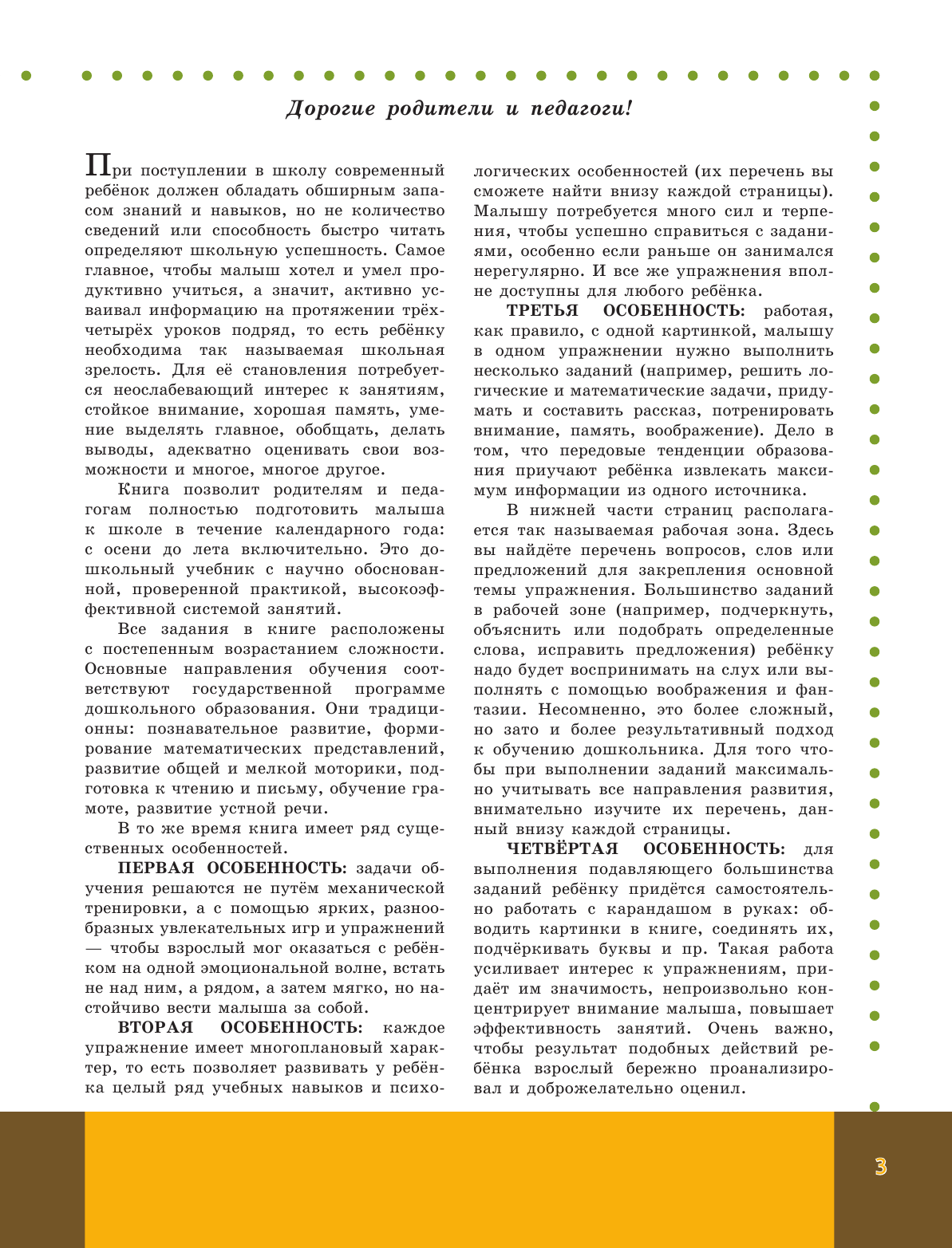 Эта книга написана опытным педагогом-практиком, состоит из 500 игровых заданий и рассчитана на длительную (в течение учебного года), эффективную подготовку ребёнка к школе. Основные направления обучения традиционны и соответствуют Государственной программе дошкольного образования: познавательное развитие, формирование математических представлений, развитие общей и мелкой моторики, подготовка к чтению и письму, обучение грамоте, подготовка руки к письму, развитие устной речи.