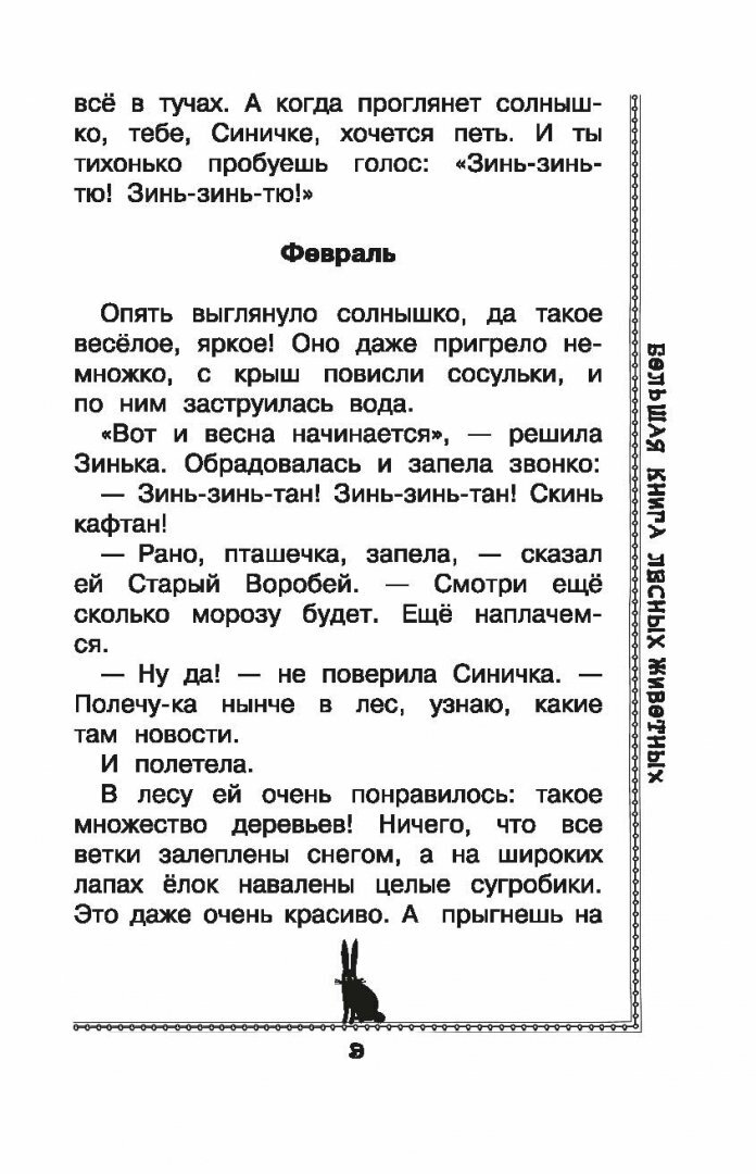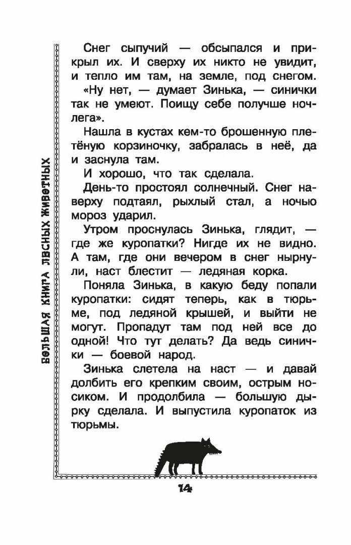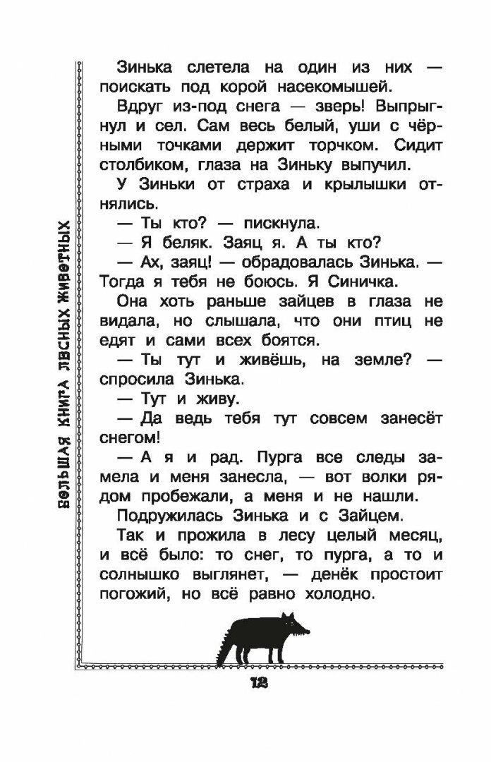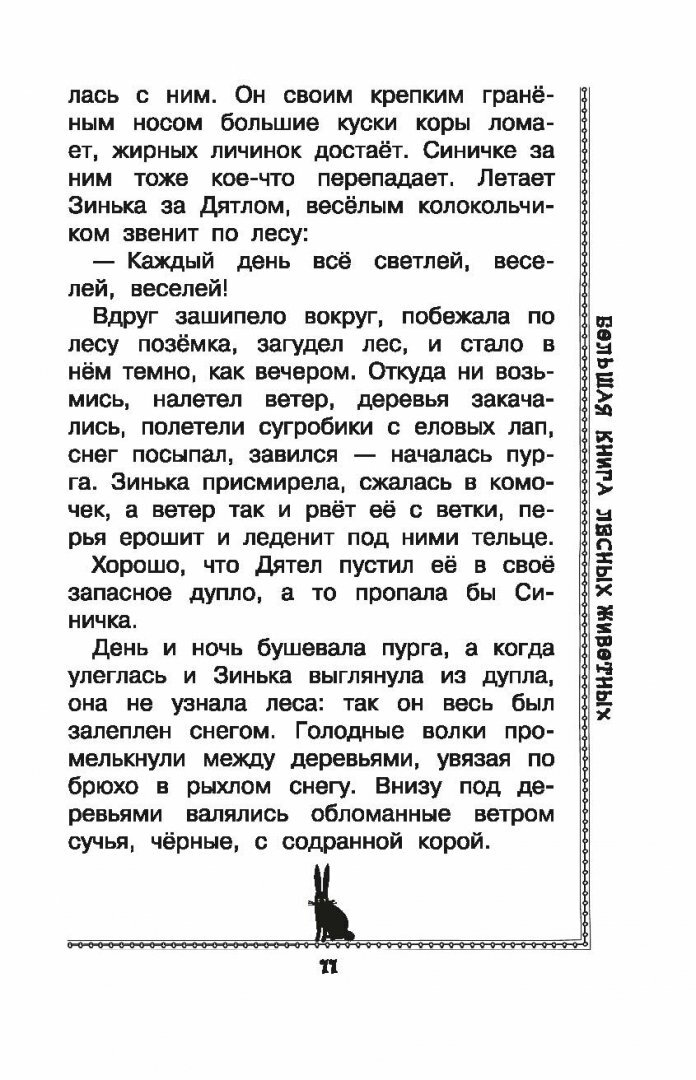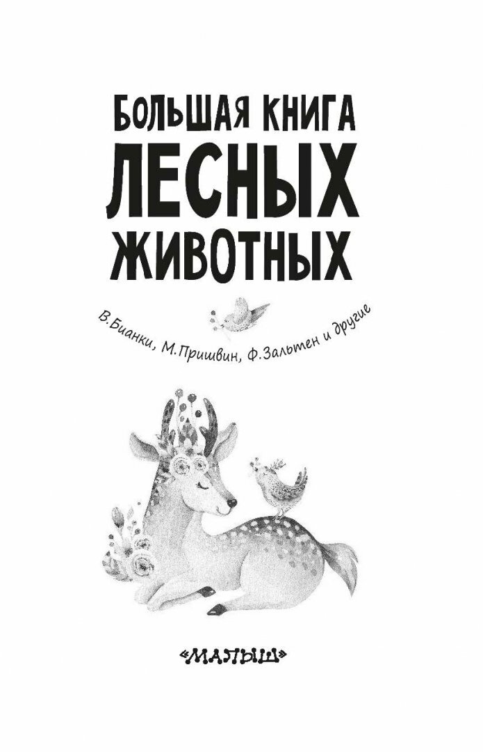 "Большая книга лесных животных", Зальтен Ф., это сборник отечественных и зарубежных писателей, прекрасных рассказов о животных. Обратите внимание, на то что все иллюстрации в данной книге черно белые! Для кого это принципиально важный момент? У нас же есть много книга с цветными иллюстрациями всех животных, в том числе и "Лесной календарь", Энциклопедии, книгу приобрели для прочтения и изучения, где то в дополнении к уже известным моментам о животных. На всей странице идет текст, и в середине листа (в самом конце текста) идет маленькая иллюстрация животного. Я бы скорее назвала это не иллюстрацией а очертаниям.