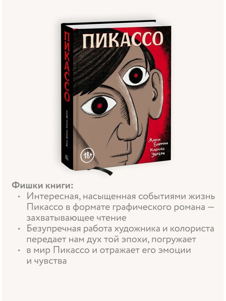 Эта графическая биография - история превращения Пабло Пикассо в титана мирового искусства. Авторы комикса, Жюли Бирман и Клеман Убрери, постепенно вовлекают читателя в насыщенную жизнь художника, рассказывая не простую историю любви, дружбы, вражды и о поисках Пикассо своего места в мире современного искусства. Как и многие художники того времени, он начинал карьеру в нищете, жил на Мормарте и сходил с ума при взгляде на Фернанду Оливье. Однако постепенно, шаг за шагом, пробуя себя в разных ипостасях, Пикассо стал основоположником нового направления в живописи - кубизма.