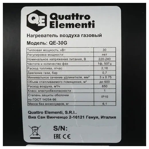 Тепловая пушка QUATTRO ELEMENTI (Четыре Элемента) предназначена для обогрева строительных площадок, различных производственных помещений, а также торговых площадей и гаражей площадью до 600 м2. Эффективный отопитель обеспечивает повышенный показатель эффективности: при умеренном расходе газа он создает оптимальное количество тепловой энергии 30 кВт. Высокоэффективный вентилятор работает от сети 220 В и выдувает воздух со скоростью 650 кубометров в час.