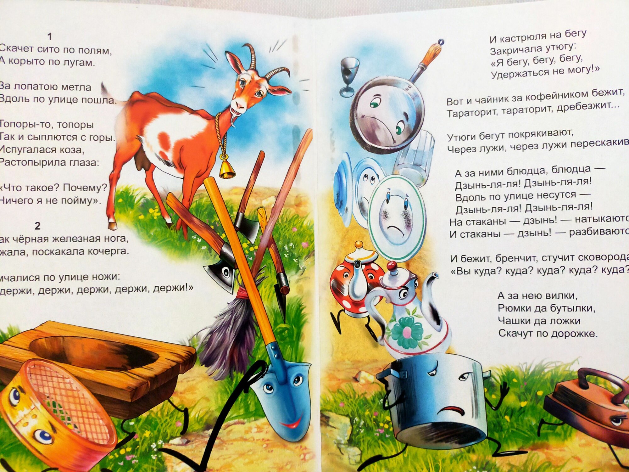 Изданная в чудесном варианте с красивыми иллюстрациями на мягком картоне книжка Корнея Чуковского "Федорино горе" про полтергейст в доме женщины по имени Федора Егоровна у которой неожиданно неодушевлённые предметы вдруг стали самостоятельно передвигаться и покидать её дом. Претензии вещей были понятны и обоснованны,Егоровна не утруждала себя уборкой и мытьём посуды. Её дом стал рассадником тараканов и вещи взбунтовались. Пришлось Федоре вымаливать у своих вещей прощение и умолять,чтобы они вернулись. Для этого ей пришлось гарантировать им стерильную чистоту. Вот такая вот поучительная сказка с элементами мистики и чудес.