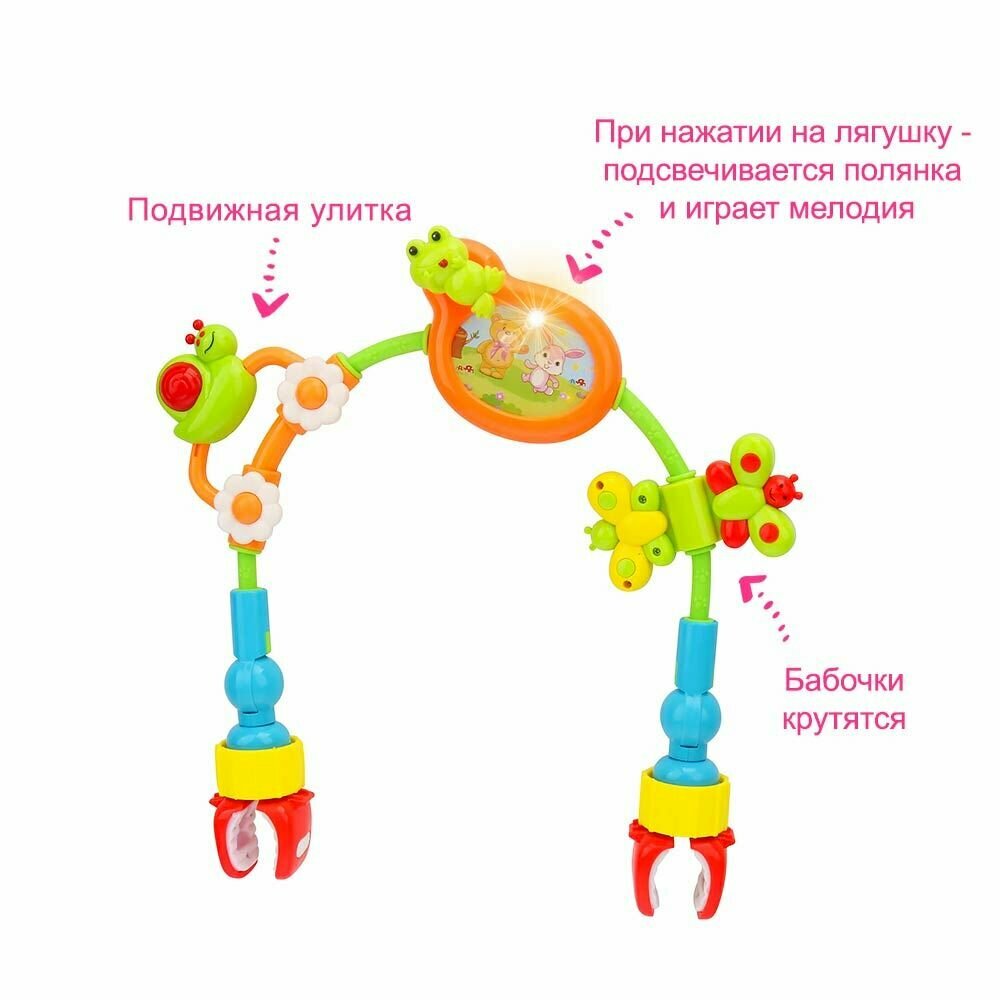Игрушка-подвеска на коляску из серии «Улыбка детства». Со световыми и звуковыми эффектами: мелодии. С механизмом. С питанием от батареек. Батарейки: 3*AG13 (входят в комплект). Основной конструкционный материал: пластмасса. Предназначено для детей от 3 мес.