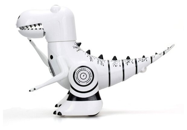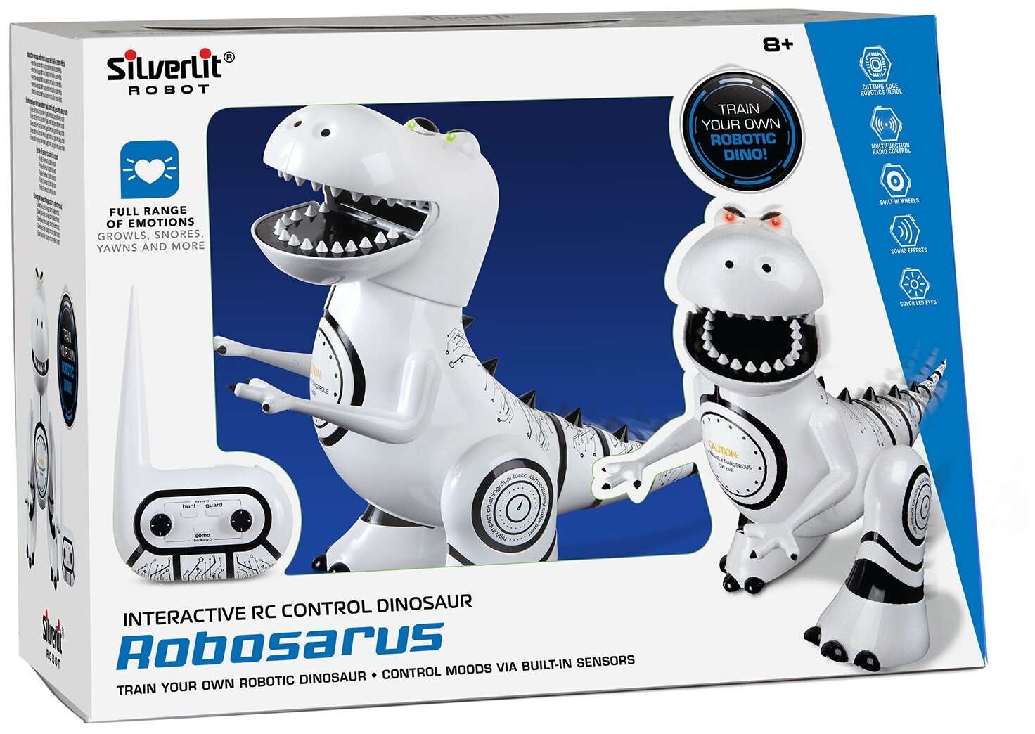 Silverlit — бренд, под код которым выпускают радиоуправляемые электронные игрушки. Робот Робозавр — станет настоящим другом для ребенка! Он умеет выражать свои эмоции: может быть спокойным или злым. У него есть датчик эмоций со звуковыми эффектами. Робозавр зевает, если устал и храпит в спящем режиме. Может находится в положении сидя и стоя. Мерцающая подсветка глаз у Робозавра отображает его настроение. Он может двигаться вперед, назад, влево, вправо. Заряжается Робот с помощью USB. У игрушки есть также функция “следуй за мной”. Дальность управления в обычном режиме около 20 м, в режиме “следуй за мной” около 5 м.