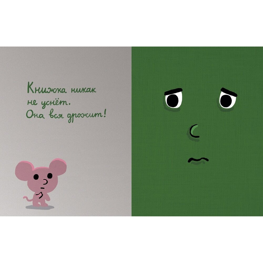 Моей книжке страшно – подскажет, как побороть страх темноты. Мышонок подскажет, что нужно позаботиться о книжке, укутав ее и включив ночник. Надо показать, что никто не прячется под кроватью и в шкафу, прокомментировать уличные звуки, дать глоток воды, поцеловать и обнять. И в этой книжке зеленый цвет страха меняется на голубой цвет усталости. Книжка успокоилась и теперь хочет спать. При этом, показывается что не надо говорить – не бойся, ты уже большая, как не стыдно бояться. Наоборот, книга учит понимать того, кто боится, и помогать мягко, без высмеиваний и поучений. С любовью.